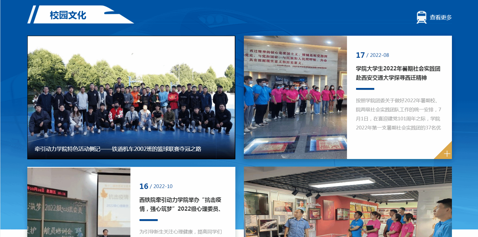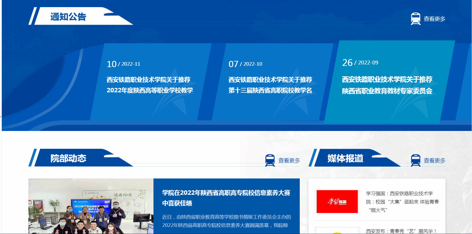 新版校园网首页以学校VI系统的“西铁院蓝”为主色调,结合学校标识、校训校风、办学理念、文化特色等,通过全新设计的UI界面充分彰显了学校近七十年的轨道交通专业文化底蕴。