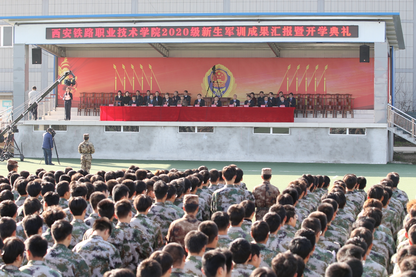上午9时50分,在庄严的国歌和院歌声中,军训汇报表演暨开学典礼准时拉开序幕。院党委书记施利民、院长赵春平、党委副书记邓耀斌、党委副书记兼纪委书记邓轩、副院长安学武、副院长赵六杰出席典礼,学院各部门负责人、军训基地主任刘子强及施训教官、4000余名新生和驻地辅导员班主任们参加典礼,典礼由党委学生工作部部长郭小莉主持。