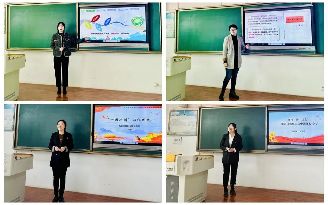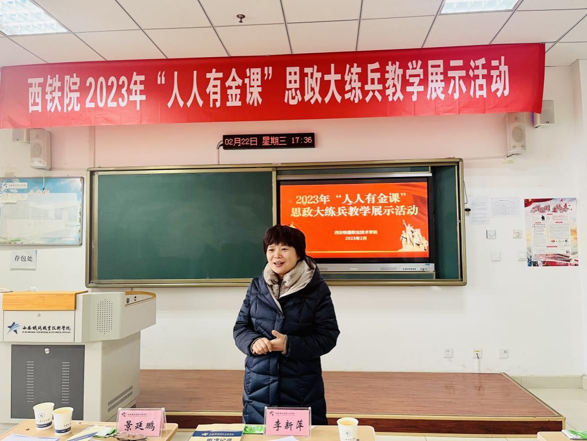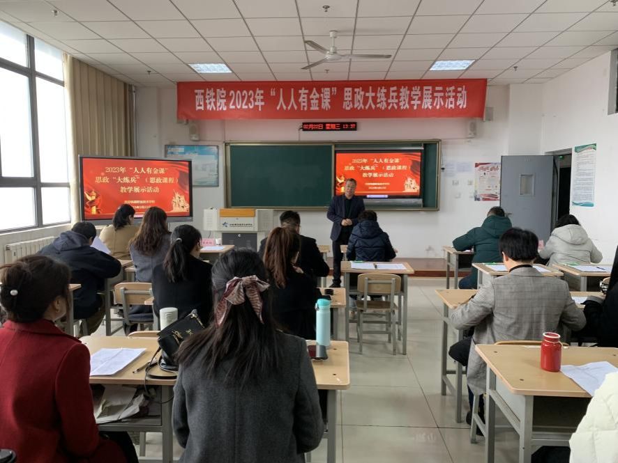 为深入学习贯彻习近平总书记在学校思想政治理论课教师座谈会上的重要讲话精神,进一步提升专职思政课教师的教学能力和业务水平,同时为2023年度陕西学校思政课教师“大练兵”活动选拔选手,2月22日,由马克思主义学院承办的西铁院2023年“人人有金课”思政“大练兵”(思政课程)教学展示活动在港务校区举行。学院党委副书记任治军全程出席了活动,陕西铁路工程职业技术学院马克思主义学院院长李新萍教授作为特邀嘉宾,教务处课程思政科科长刘力郡、发展规划处副教授王旭波作为评委出席此次活动。马克思主义学院院长景延鹏带领全体思政课教师全程参与。