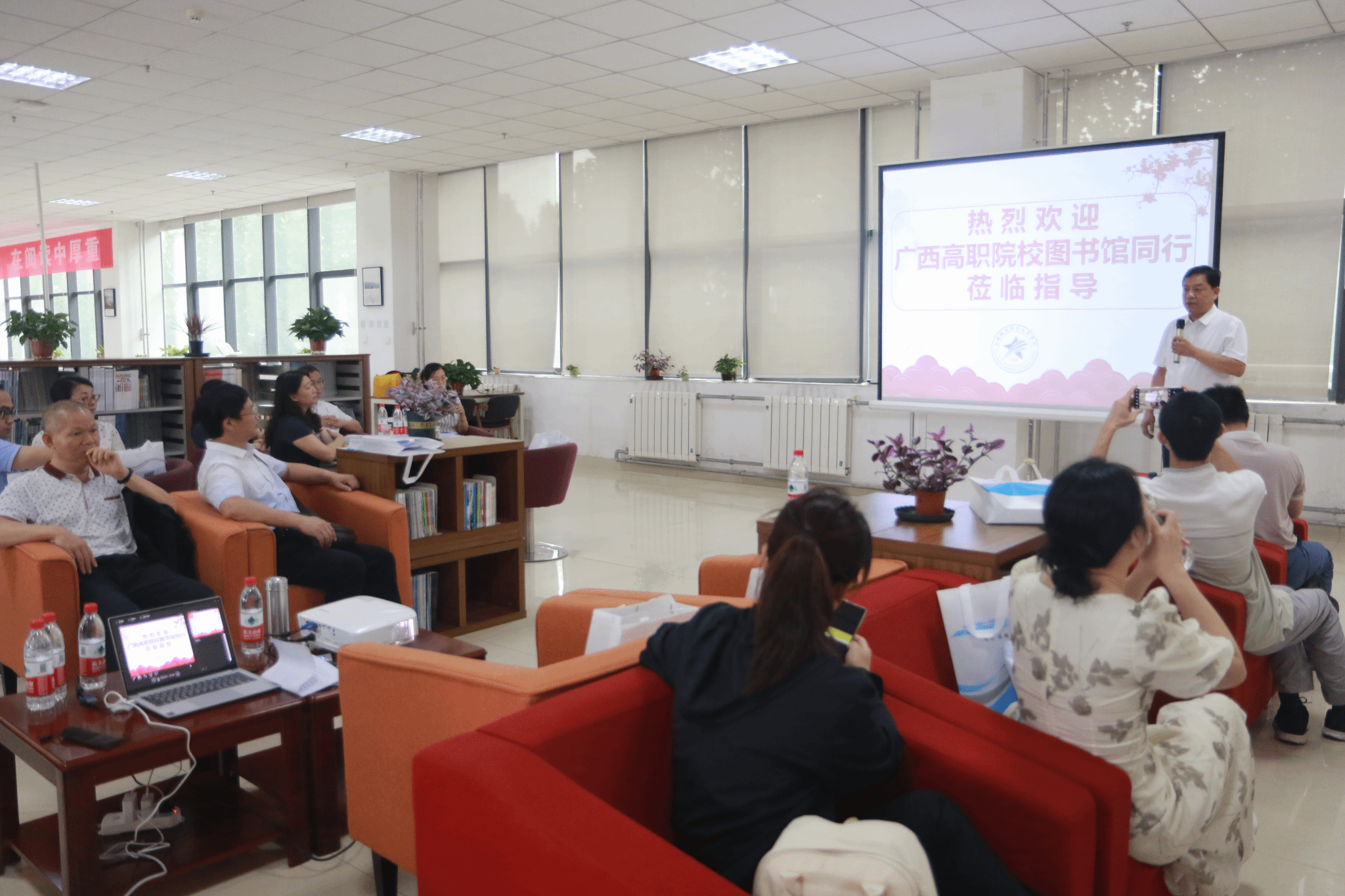 7月6日上午,广西高职院校图书馆代表团一行30余人来贝博官网交流考察。党政办公室主任张爱民、图书馆馆长袁素瑛在办公楼门口迎接了广西图书馆同行代表。张爱民、袁素瑛在办公楼一楼大厅借助思政展板向广西同行来宾介绍了贝博官网思想政治工作的的特色与成绩,随后进入图书馆进行参观学习和座谈交流。