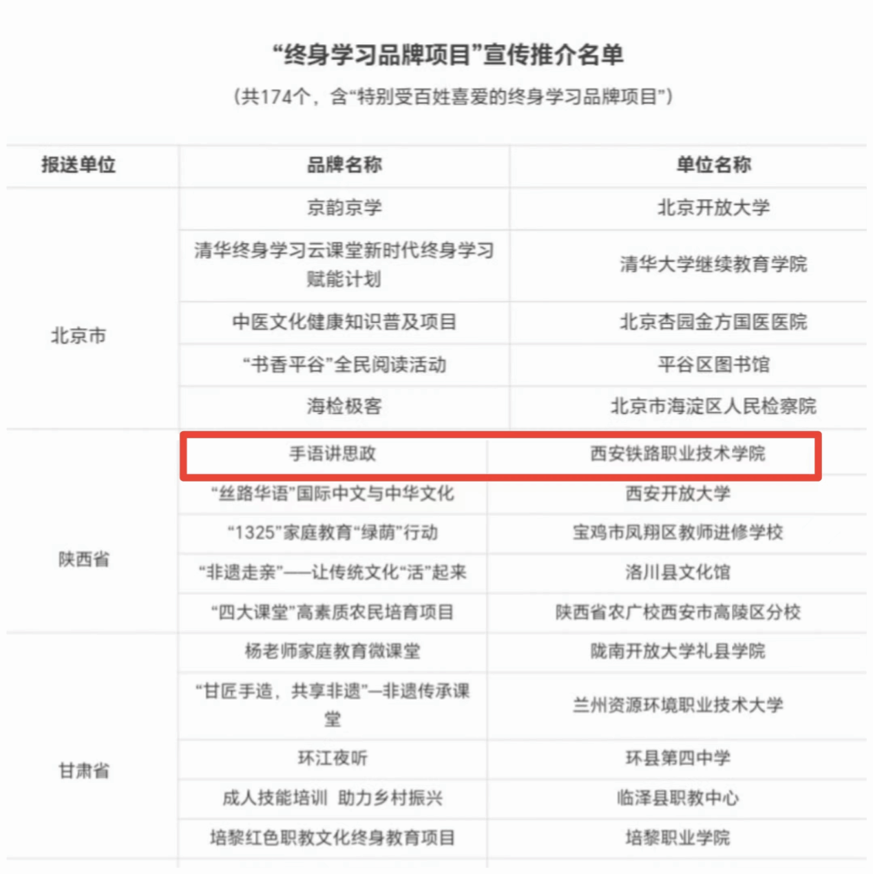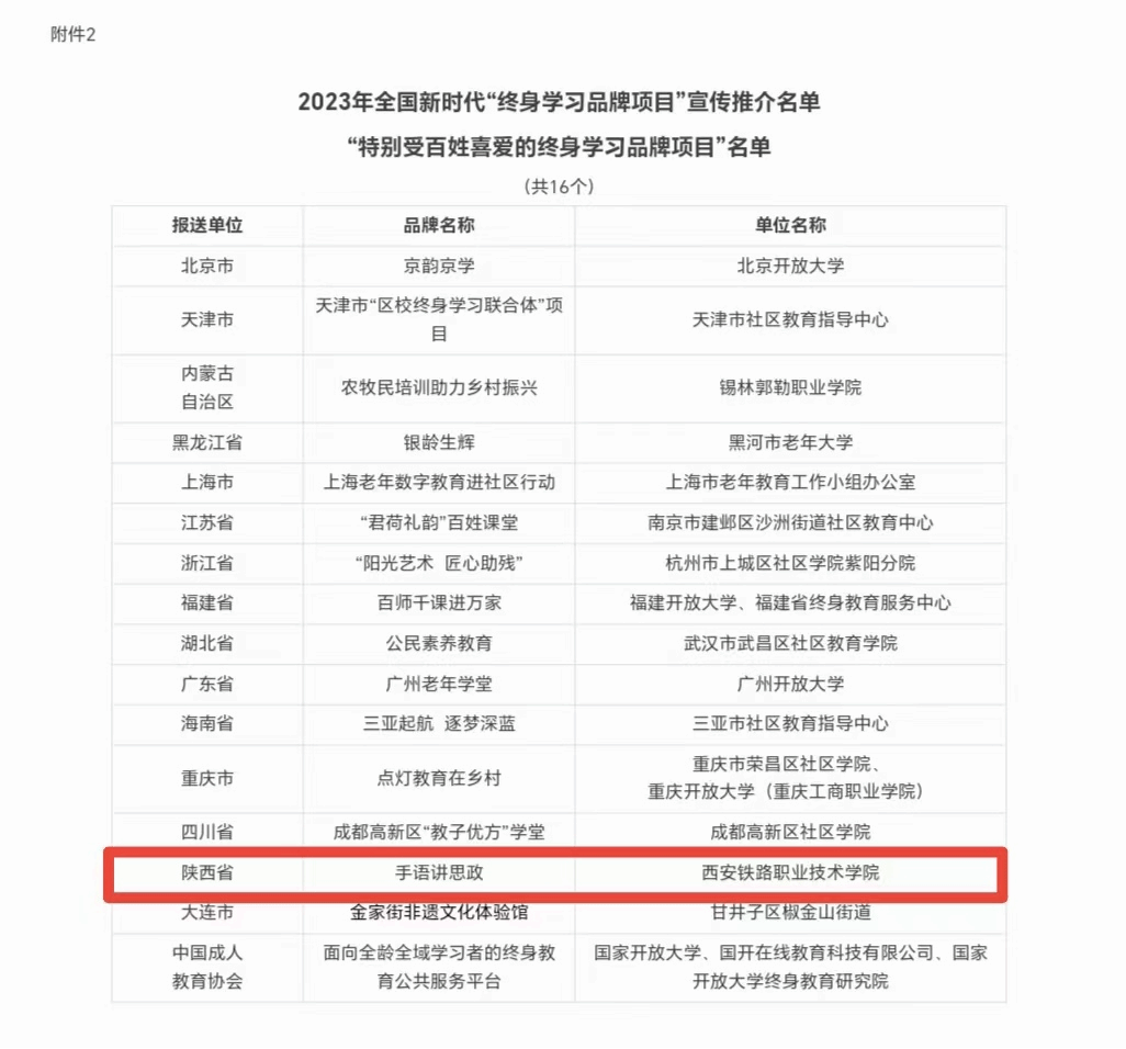 8月31日,中国成人教育协会网站公布了2023年全国新时代“百姓学习之星”和“终身学习品牌项目”宣传推介名单,贝博官网交通运输学院刘峥老师主持的《手语讲思政》项目喜获2023年全国新时代“特别受百姓喜爱的终身学习品牌项目”(全国仅有16个),同时入选“终身学习品牌项目”推介。