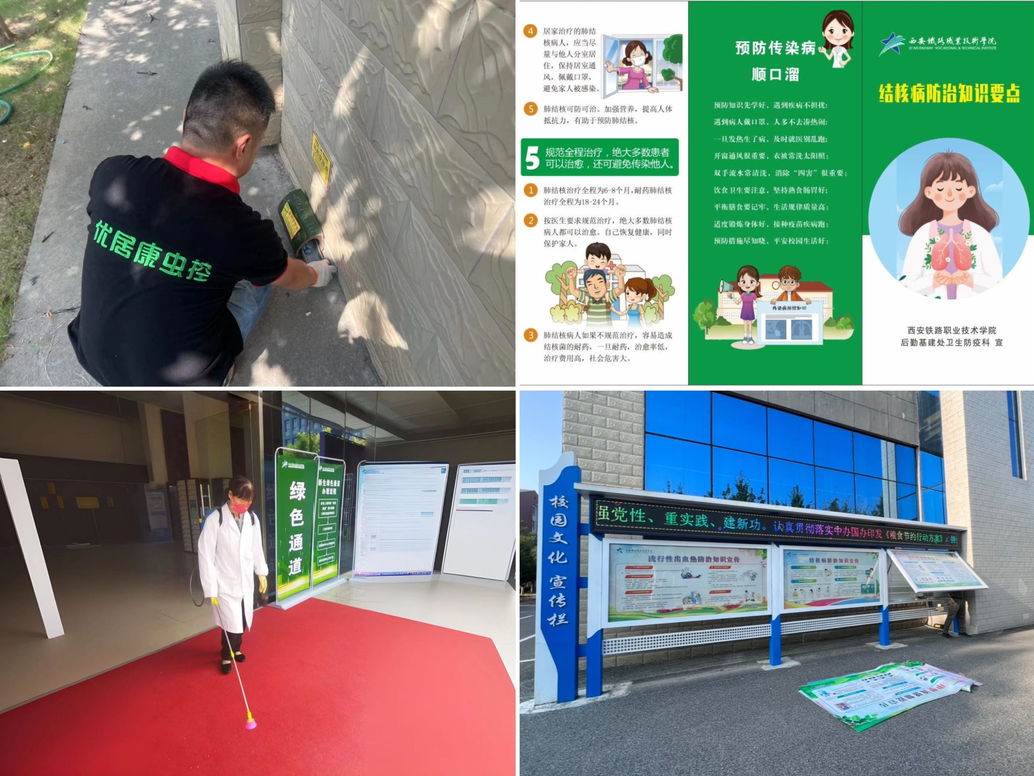 消杀灭鼠,防疫先行。卫生防疫科为学生提供一个安全、卫生、舒适、整洁的校园环境,在学生公寓、教学楼、食堂等重点区域开展深度消杀及灭鼠工作,反复清剿病毒和细菌,不放过任何一个卫生死角。并制作《结核病防治知识要点》手册,在学生前往食堂必经之路的广告栏中宣传有关秋季易发传染病的防治知识。做好卫生防疫工作,为学生的安全健康保驾护航。