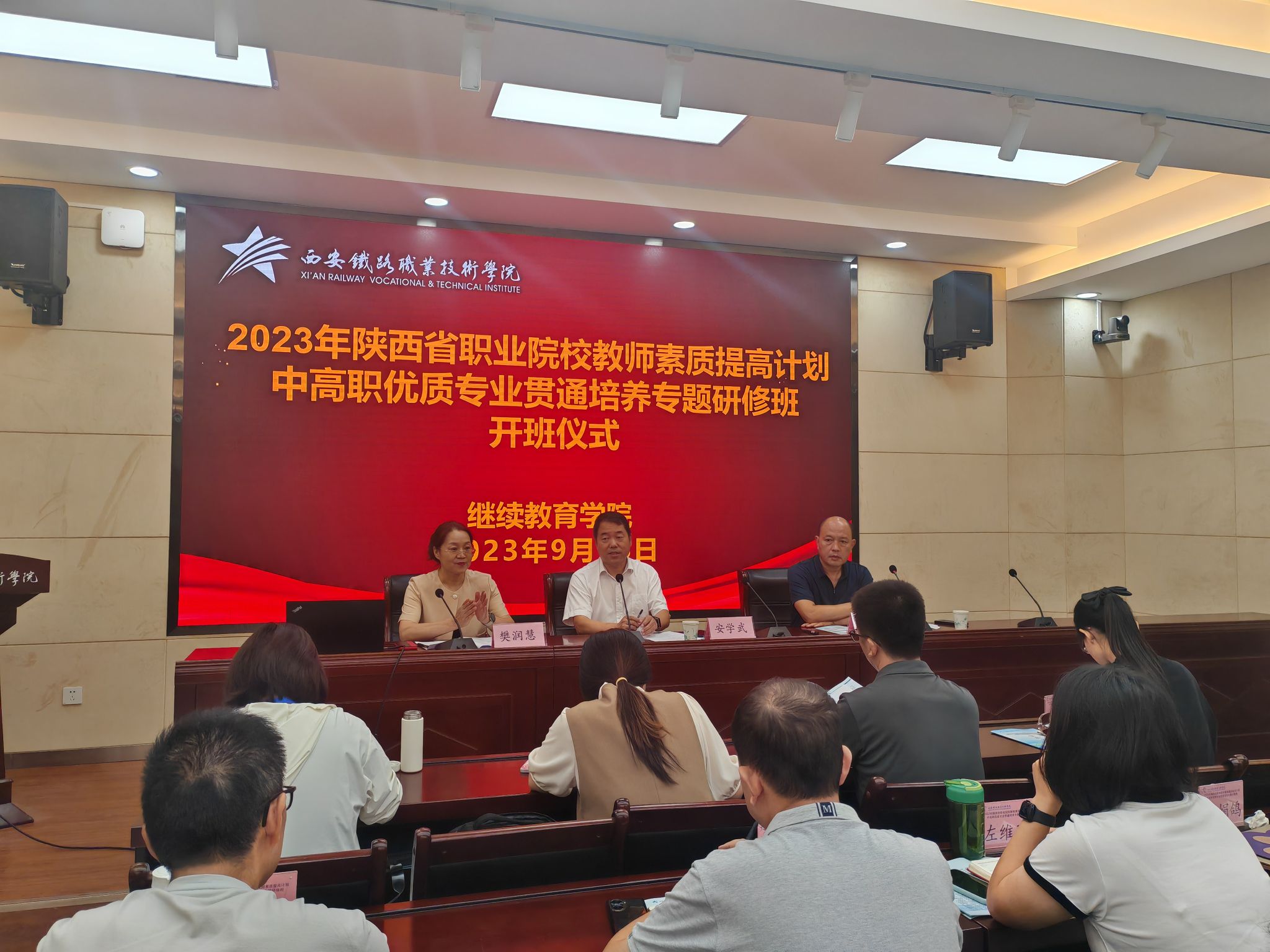 2023年9月18日上午, 2023年度陕西省中高职优质专业贯通培养专题研修班在贝博官网自强校区顺利开班。学校继续教育学院院长樊润慧主持开班仪式,学院副院长安学武出席并致辞,学校发展规划处处长马军强介绍培训方案,来自全省的40余名中高职院校管理人员、专业带头人、骨干教师及培训班班主任参加了开班仪式。