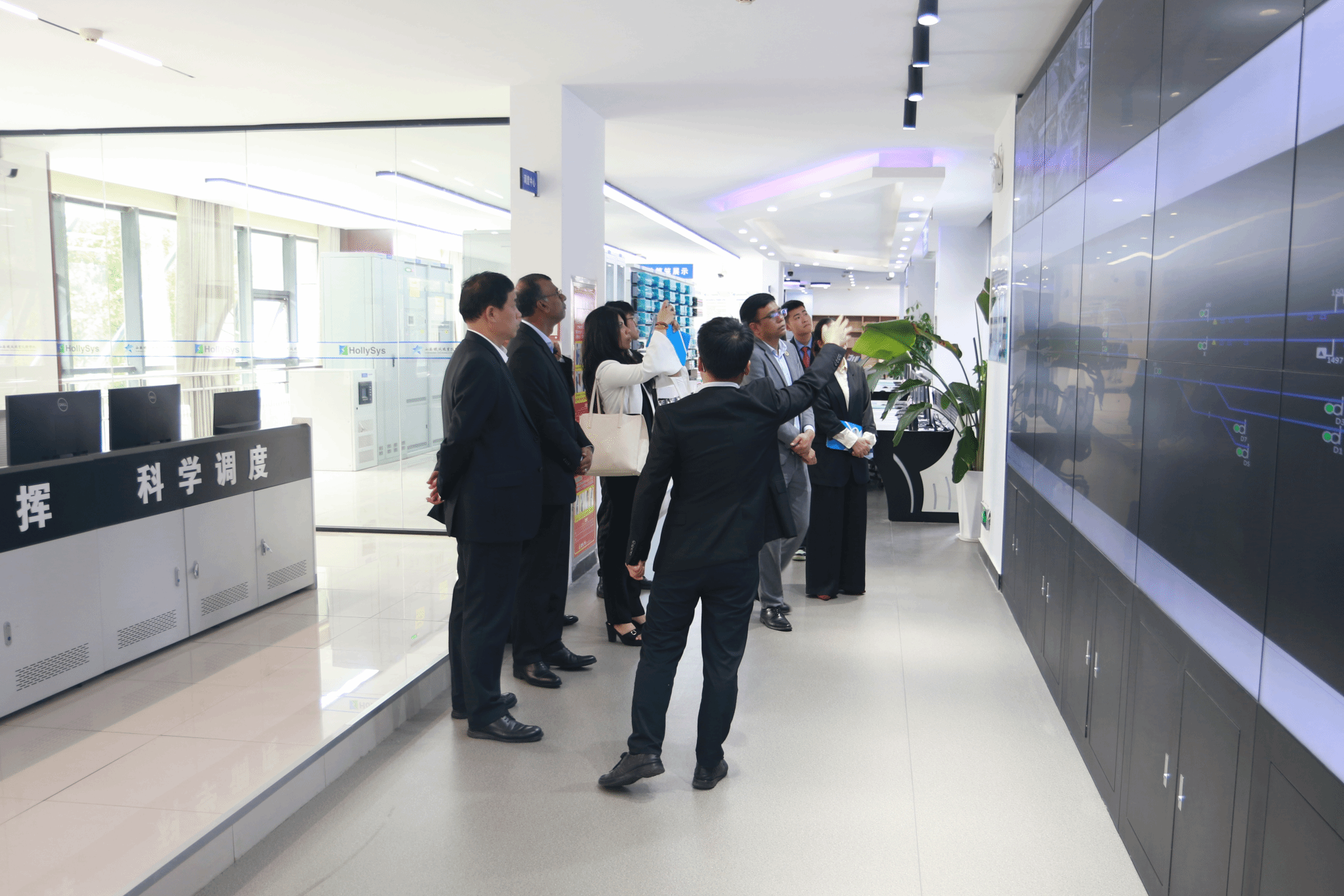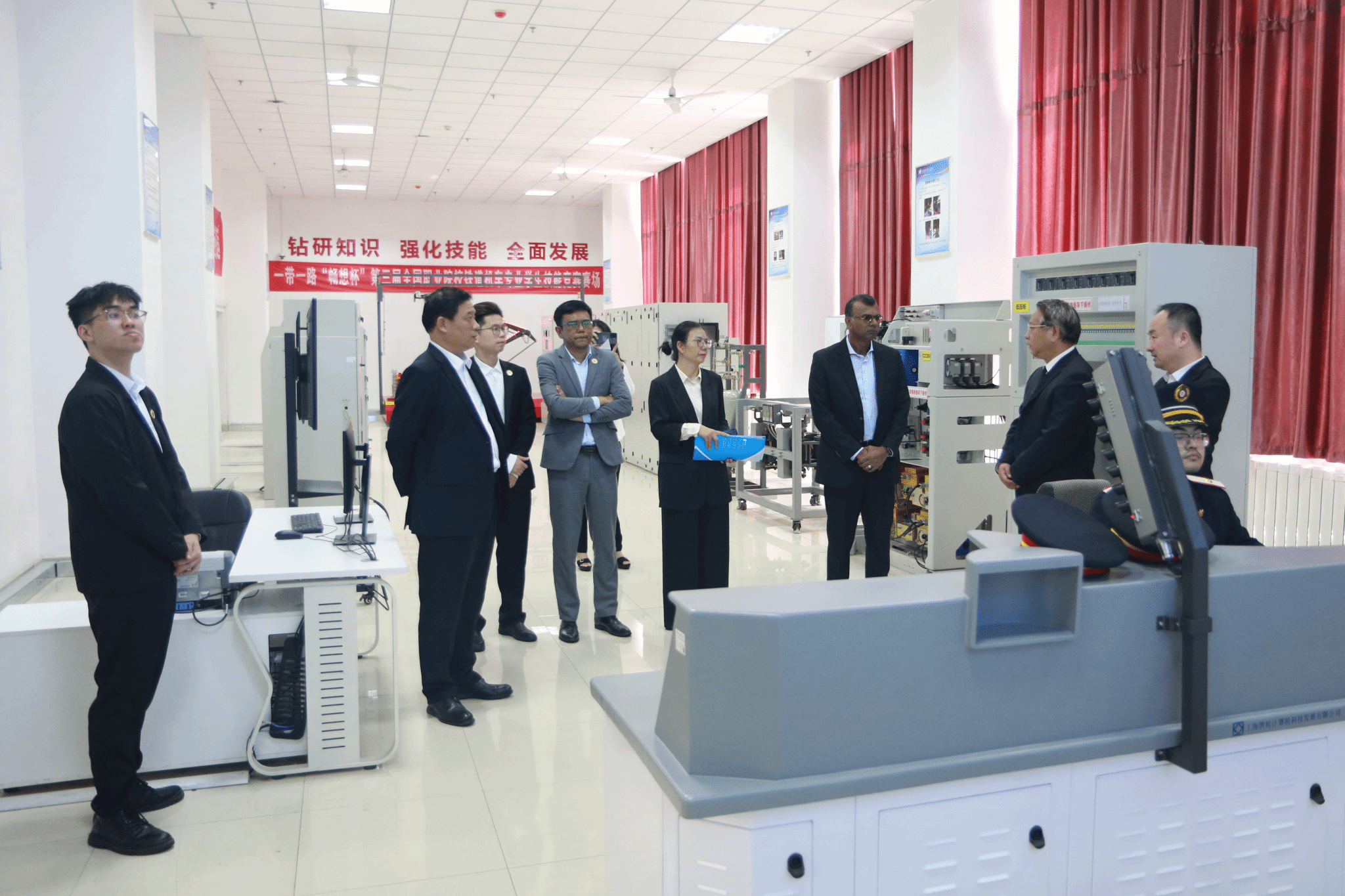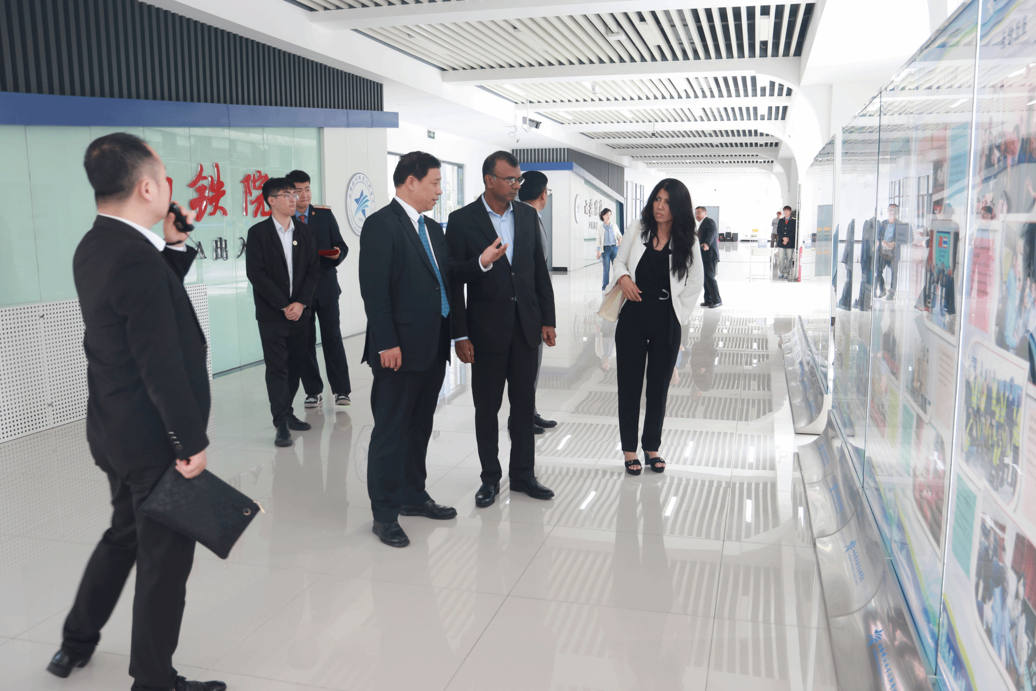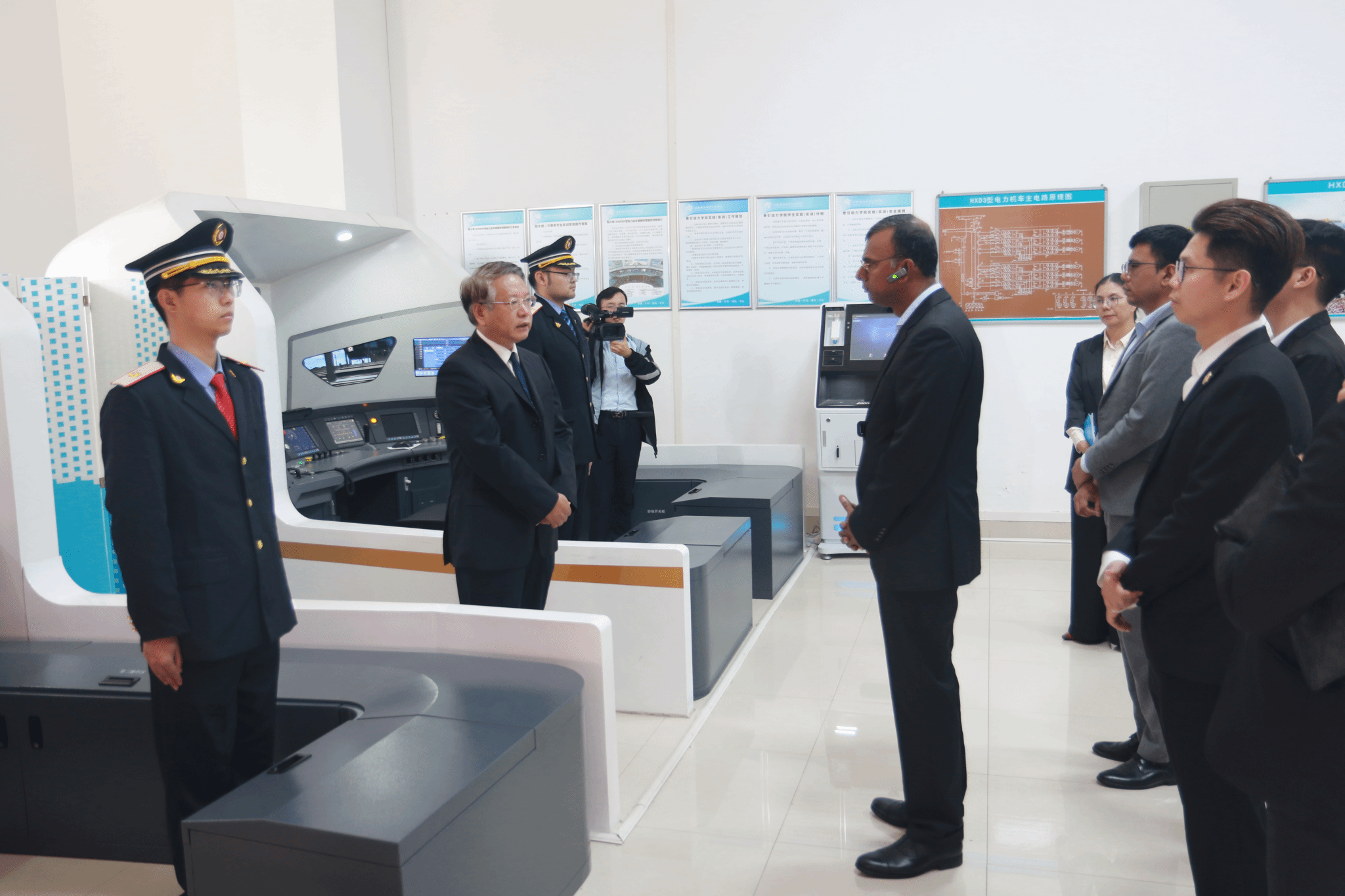 拿督拉古一行参观了学院轨道交通综合实训中心、牵引动力综合演练场、复兴号动车组模拟驾驶实训室等学生实训中心。参观中,牵引动力学院院长李益民向客人介绍了中国高铁的发展以及学院人才培养模式,同时就学院为肯尼亚蒙内铁路、哥伦比亚波哥大地铁1号线项目人才培养的基本情况进行介绍,并表示愿意为马来西亚轨道交通发展贡献力量。