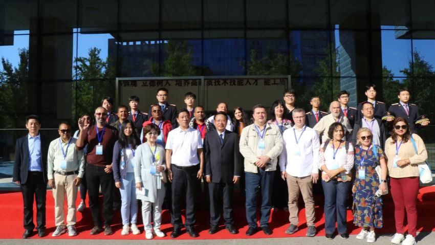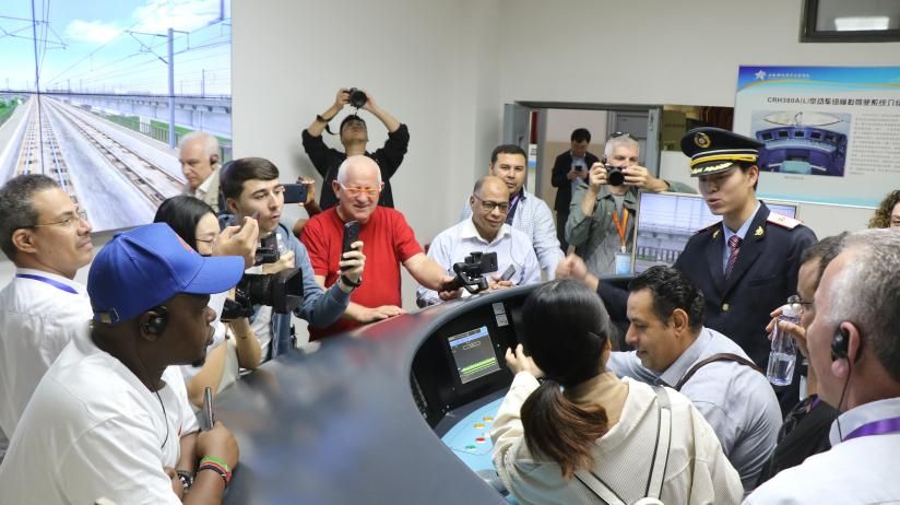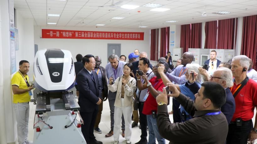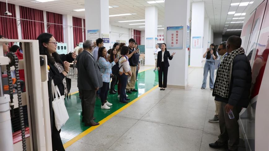 “一带一路”共建国家媒体代表一行参观了学院轨道交通综合实训中心、牵引动力综合演练场、复兴号动车组模拟驾驶实训室等学生实训中心。
