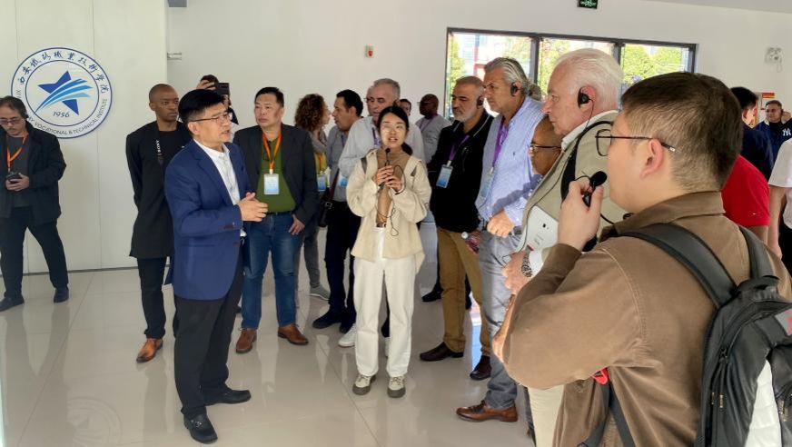10月15日下午,中国记协党组成员吴旭、中国记协国际部主任陈涛带队“一带一路”共建国家和地区部分记者组织负责人和媒体代表一行近百人来贝博官网交流访问,媒体记者们分别来自阿根廷、巴西、墨西哥、印度尼西亚、美国、老挝、哈萨克斯坦等30个国家,市宣传部外宣处处长刘华、学院院长赵春平、学院副院长熊奇及国际交流与合作处处长仵崇智、副处长靳丽君等部门负责的同志全程陪同参观。