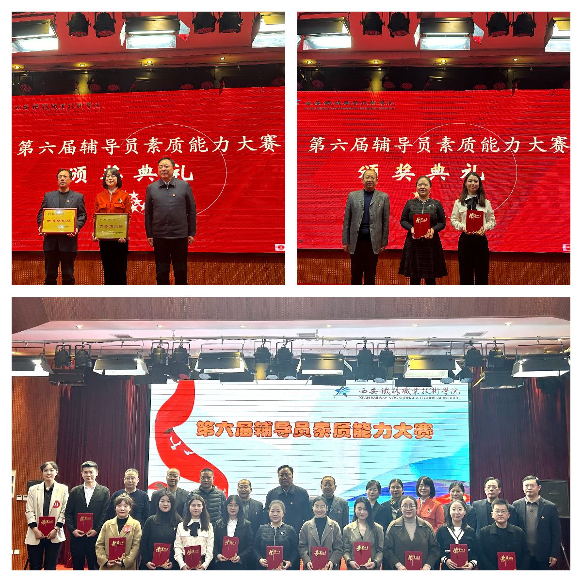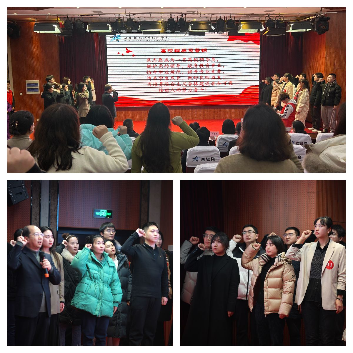 比赛现场,组委会根据三个环节比赛的表现计算选手总成绩,最终牵引动力学院杨若、土木工程学院雷涵尹两位老师荣获一等奖;机电工程学院丁泽豪、党委学生工作部朱江月、机电工程学院杨倩、交通运输学院李锦秀荣获二等奖;交通运输学院李悦箐、机电工程学院王倩、牵引动力学院许静漪、国际交通学院赵军、电气工程学院曹纹靖、交通运输学院武哲荣获三等奖;牵引动力学院和机电工程学院获得优秀组织奖。比赛间歇,党委学生工作部组织了辅导员入职宣誓仪式,2023年新入职辅导员高举右拳,在全体参会领导、师生的共同见证下,做出了自己的庄严承诺,立志为培养社会主义合格建设者和可靠接班人而努力奋斗。
