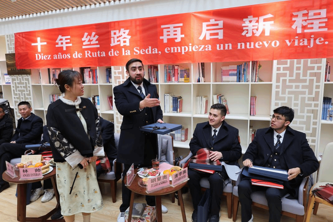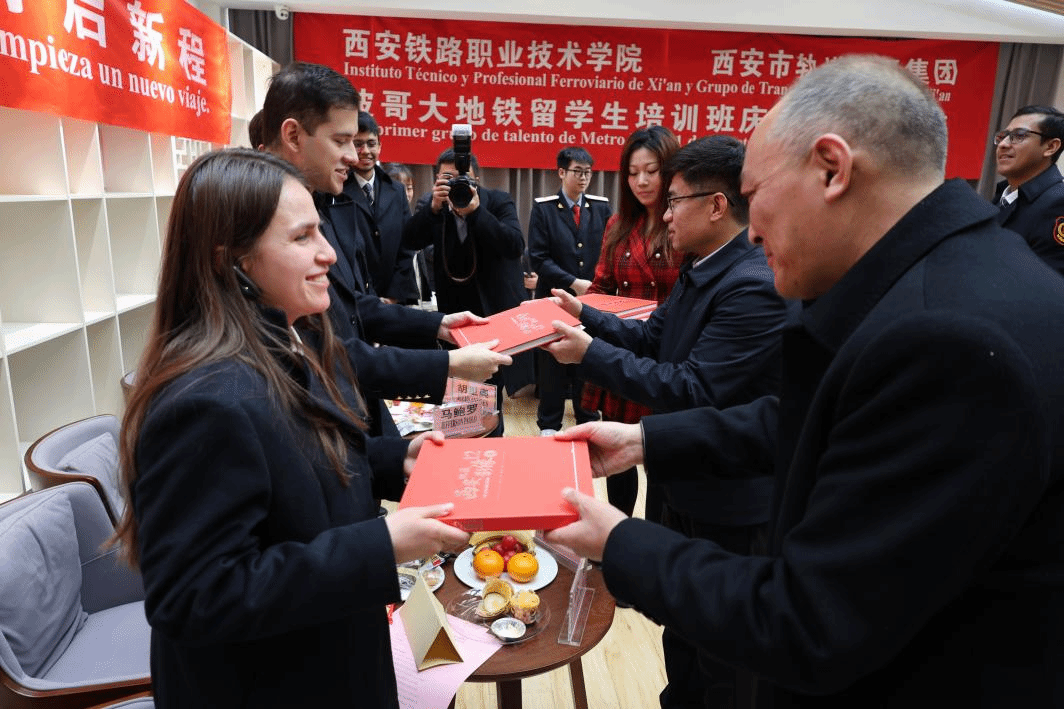 在迎新年交流环节,哥伦比亚留学生代表马鲍罗等四名学生代表用中文介绍自己,分享了自己来中国这段时间的学习与生活,并对学院和西安地铁对他们的培养、关心表示感谢,并表示一定不辜负领导的厚望,勤于学习,善于创造,以优异成绩完成学业,学好中文和中国文化,在轨道交通和文化交流方面做中国和哥伦比亚的使者。