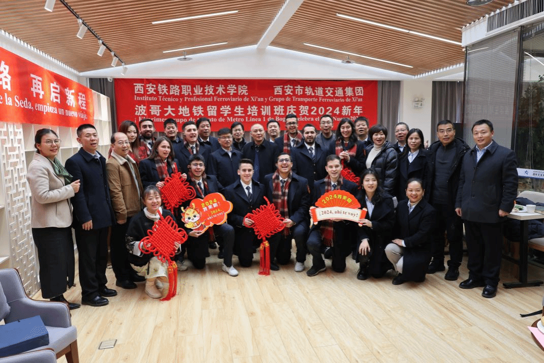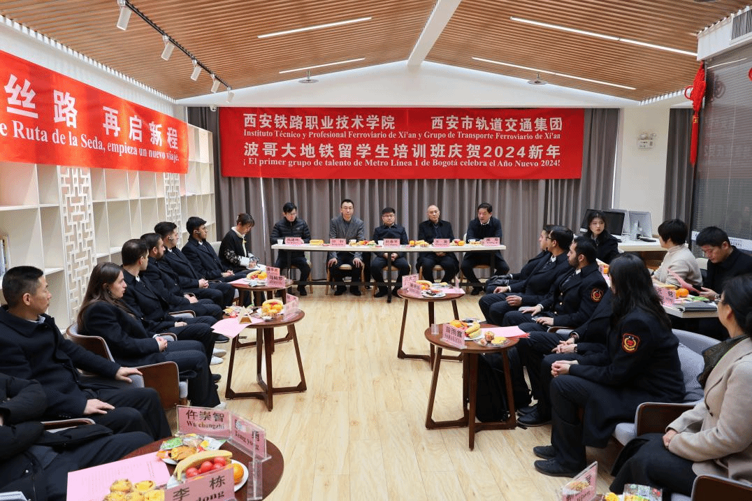12月28日,ballBET贝博BB艾弗森与西安市轨道交通集团有限公司携哥伦比亚波哥大地铁留学生培训班,开展了“十年丝路 再启新程”庆贺2024新年活动,活动在贝博官网国际交流中心举行。西安市轨道交通集团运营分公司党委书记王鉴、副总经理禹建伟,学院院长赵春平、党委副书记、纪委书记邓轩以及校企双方相关部门负责人、10名哥伦比亚留学生等参加了迎新年座谈会,活动由学院副院长熊奇主持。