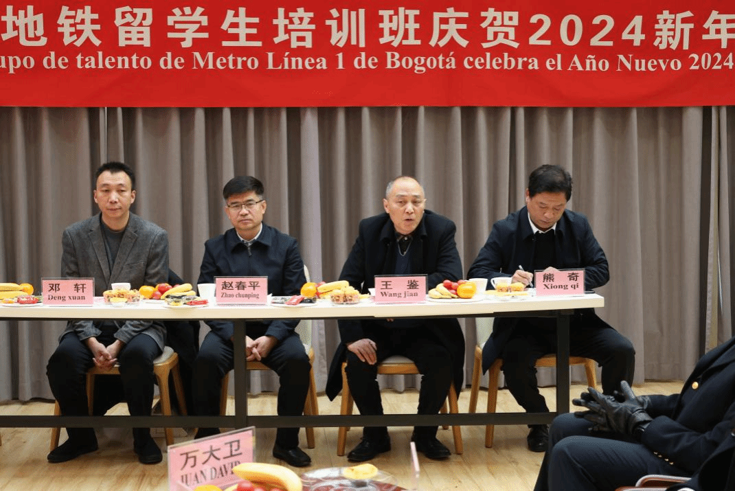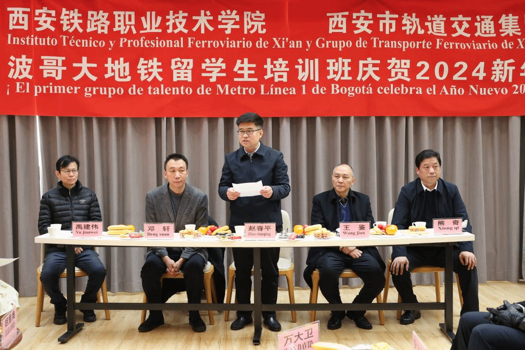 王鉴代表西安市轨道交通集团有限公司向留学生、学院领导和老师、西安地铁海外培训项目全体人员表达了感谢和诚挚的新年祝福,并对哥伦比亚留学生不远万里来到中国学习地铁运营和维护专业技术,体验博大精深的中国传统优秀文化,在促进中国与哥伦比亚友好交流合作上发挥了积极作用。他赞扬学院为哥伦比亚留学生提供了“专业化、特色化、精细化”的教学培养和实践锻炼,为培育国际化、应用型轨道交通骨干人才做出了积极贡献、取得了显著成效。他也希望留学生们抓住时机,不辜负国家、学院和西安地铁对他们的培养,也希望他们未来对于波哥大城市交通的改善,对哥伦比亚经济发展和国家进步将会做出巨大的贡献。