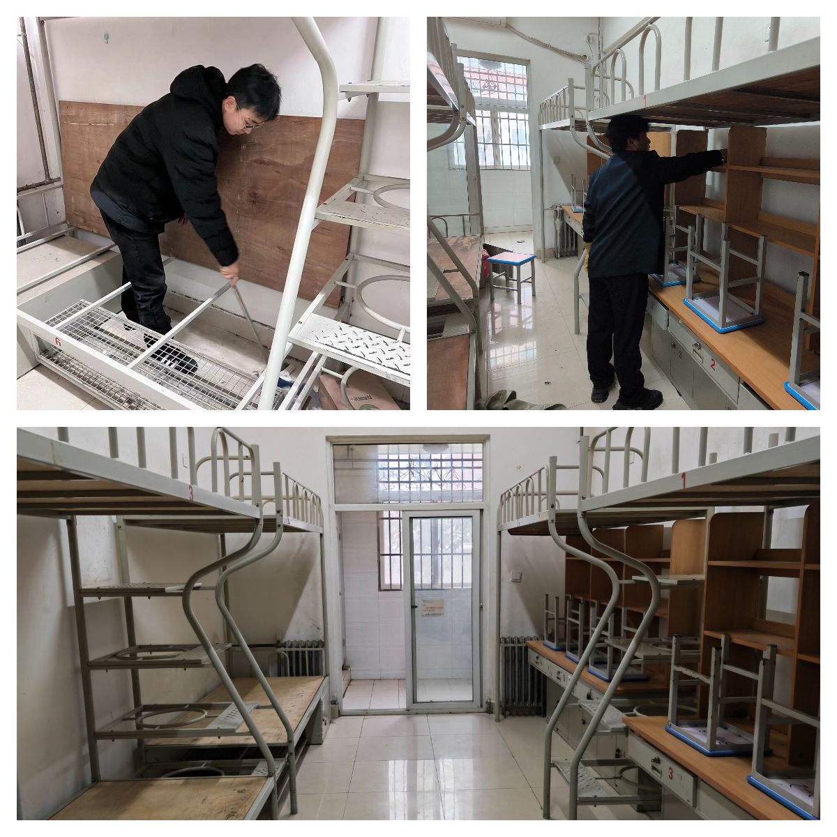 1月15日晚,各二级学院学工办协调确定腾出宿舍号。1月16日上午,2250个编织袋分发到各院部。大一大二的学弟学妹们期末考试交卷之后,在辅导员的动员、组织下立即行动,伴随着2024年的第一场大雪,于下午16点前完成183间宿舍全部个人物品清理、搬迁和腾空,并为要参加培训的学长们打扫干净宿舍,用整洁温馨的环境表达欢迎之情。
