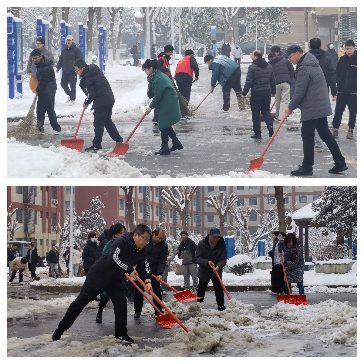 由于西安连续降雪天气,道路积雪、结冰。1月17日上午,学工部会同各二级学院,组织未离校学生与领导、老师一起铲冰除雪,清扫道路,并在各公寓张贴了醒目的报到指示牌,协调后勤基建处、计财处为远到而来的外校学生提供了备品购买、开通一卡通服务,全面作好培训学员入住准备工作,展示了贝博官网学工队伍召之即来、来则能战、战无不胜的铁军作风和敢打硬仗、能打硬仗的强大战斗力、执行力。