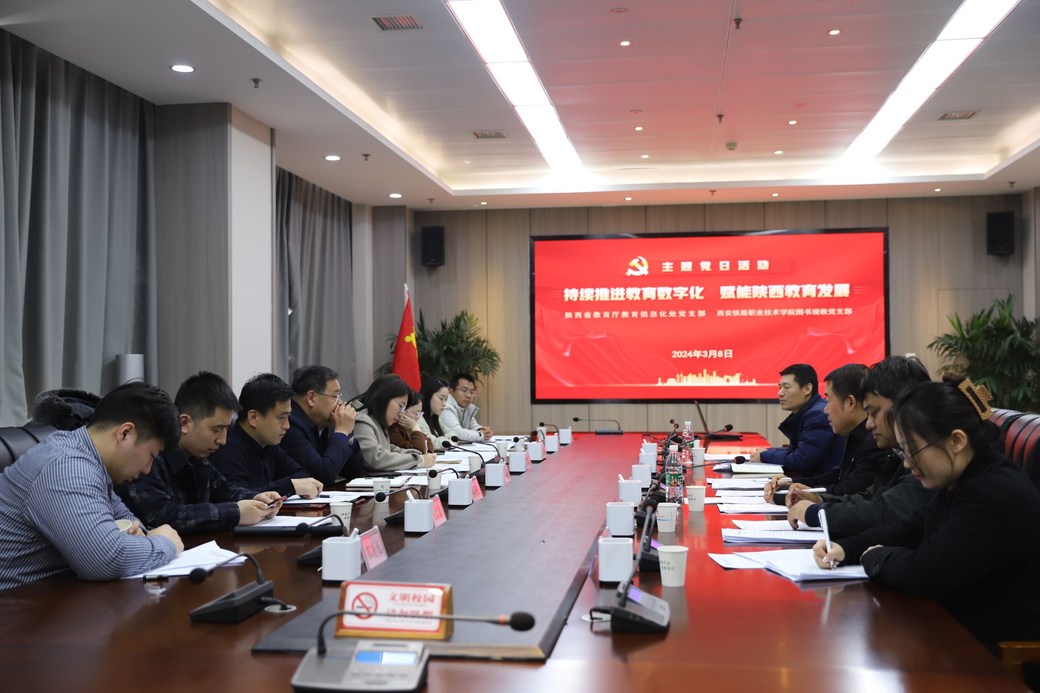 3月8日上午,陕西省教育厅信息化处党支部联合贝博官网现教图书党支部开展主题党日活动。本次主题党日活动主题为“持续推进教育数字化,赋能陕西教育发展”,陕西省教育厅信息化处处长李享阳、副处长刘贺英和信息化处干部党员以及贝博官网副院长安学武、现教中心主任王树、处室部分党员干部参加了联合主题党日活动。