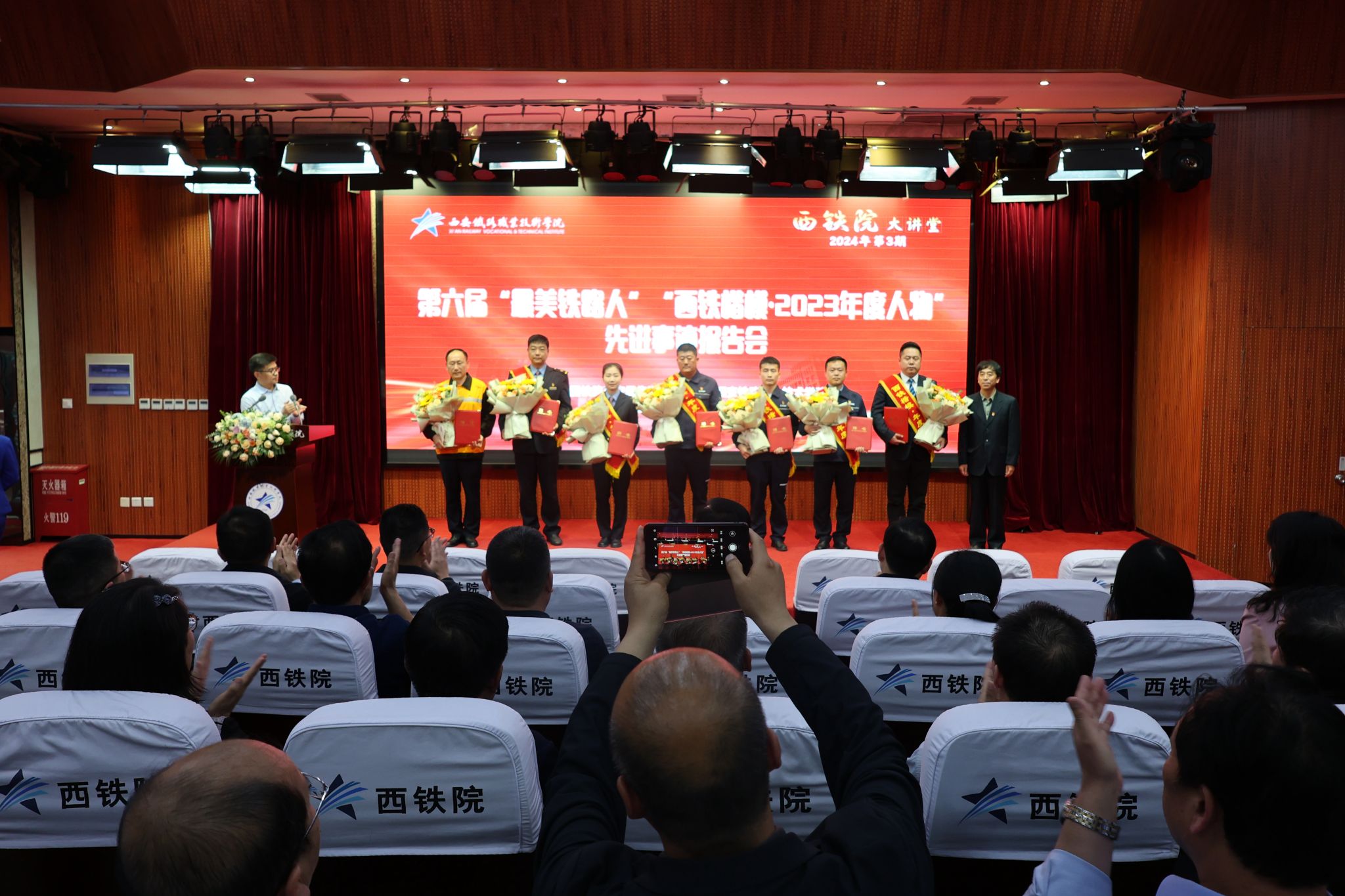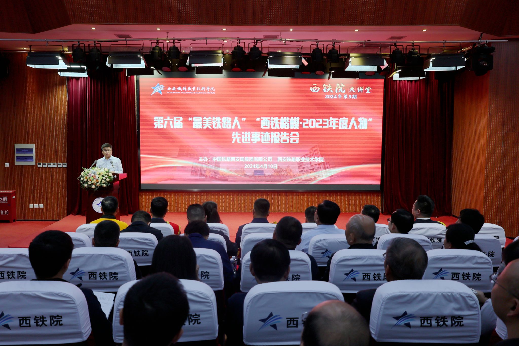 4月10日,贝博官网举办2024年第三期“西铁院大讲堂”,邀请中国铁路西安局集团有限公司的全国第六届“最美铁路人”及“西铁楷模·2023年度人物”代表来校作宣讲报告。党委书记施利民出席并讲话,中国铁路西安局集团有限公司党委宣传部副部长梁波、宣传科科长王浪出席,学院全体处级干部、党校优秀学员代表现场参会,1.7万余名师生通过直播线上收看。报告会由院长赵春平主持。