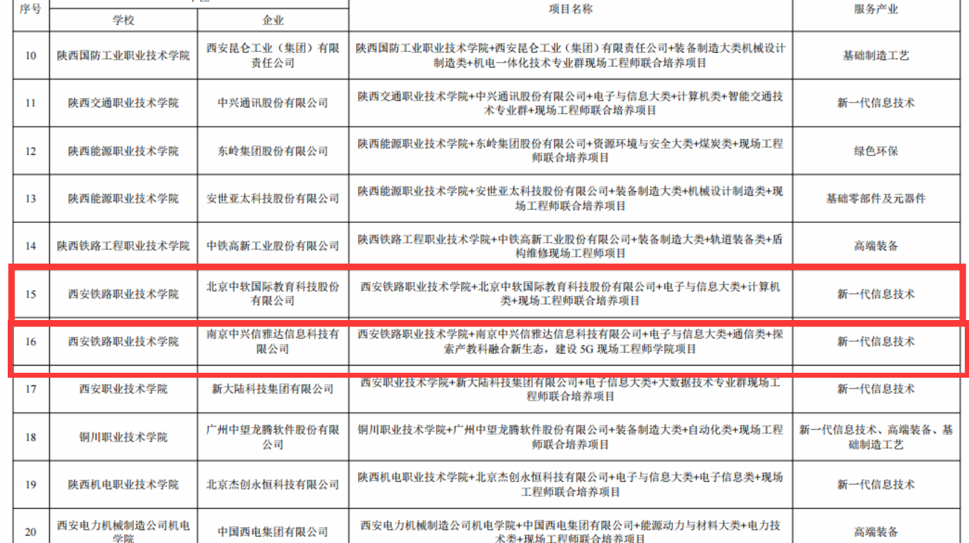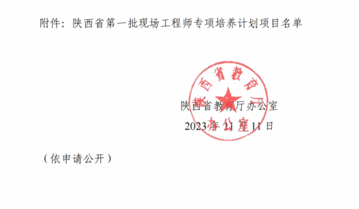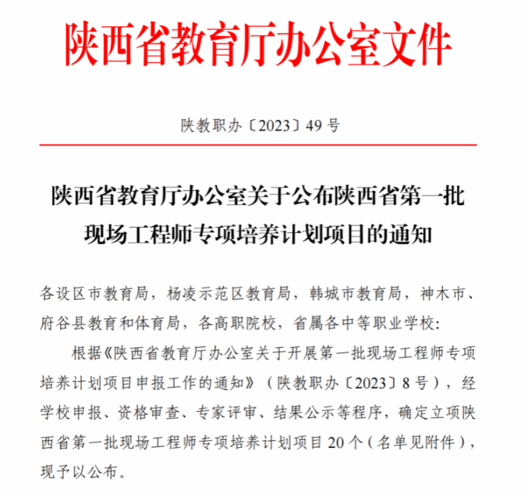 2023年11月,《陕西省教育厅办公室关于公布陕西省第一批现场工程师专项培养计划项目的通知》(陕教职办〔2023〕49号)公布省级立项现场工程师项目,其中贝博官网与北京中软国际教育科技有限公司联合培养计算机类现场工程师项目成功获批。