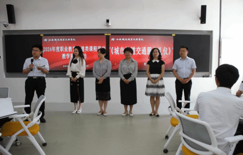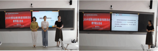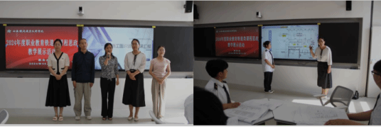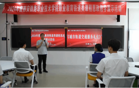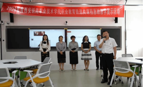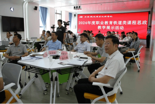 本次活动分为两个部分,第一部分为2024年度职业教育铁道类课程思政教学展示活动。由《城市轨道交通服务礼仪》《城市轨道交通通信信号设备》《施工图识读》教学团队,结合本校办学定位、专业特色和人才培养要求,从课程思政建设方向、建设重点,建设目标等方面分别进行说课及教学展示。