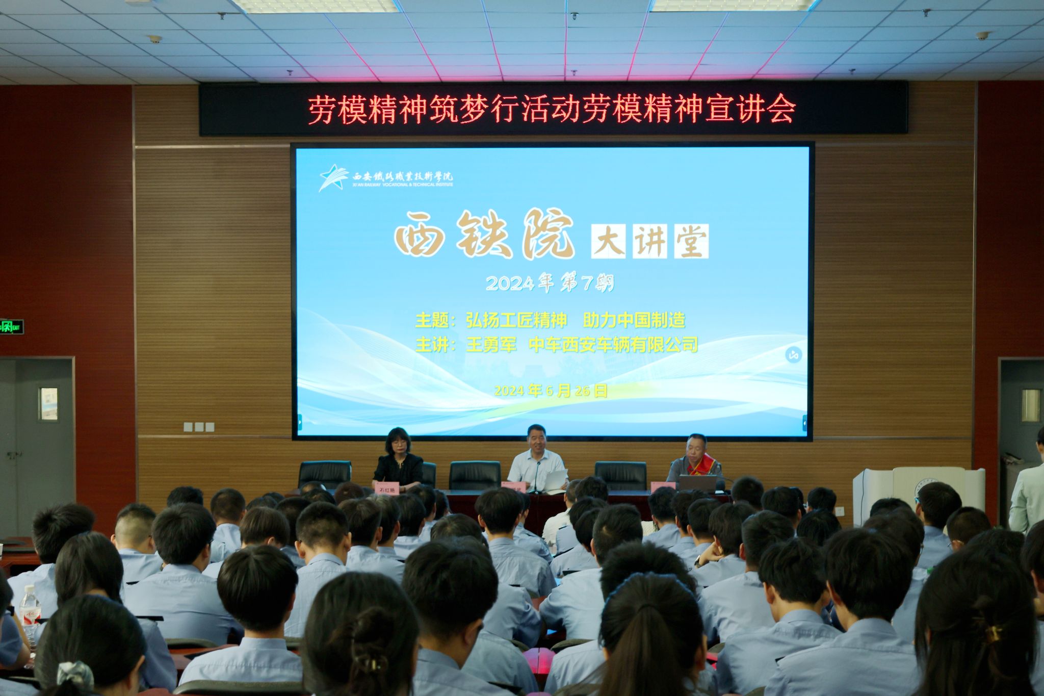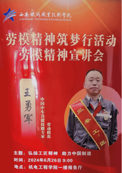 为进一步贯彻党的二十大精神,深入学习习近平总书记在全国劳动模范和先进工作者表彰大会上的讲话精神,落实立德树人根本任务,加强职业教育和职工教育,大力弘扬劳模精神、劳动精神和工匠精神,6月26日,由西安职教联合会主办、西安市总工会职工技术培训中心承办的2024年“劳模工匠精神筑梦行”劳模工匠进校企系列活动在贝博官网开展。贝博官网特邀中车西安车辆有限公司首席技能专家、劳动模范王勇军来校进行劳模事迹分享、现场技术指导以及交流座谈。参加此次活动的人员有ballBET贝博BB艾弗森副院长安学武、西安职教联合会秘书长石红艳、学院发展规划处副处长丁洪芬、机电工程学院院长代礼前、机电工程学院党总支书记张秀红、机电工程学院副院长郭峰,学院部分专业教师以及铁道车辆技术学生代表,共计200余人。此次活动由学院副院长安学武主持。
