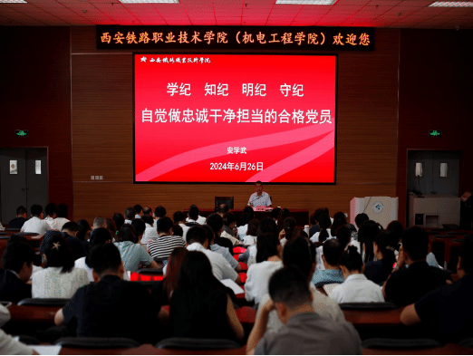 为深入学习贯彻习近平总书记关于加强党的纪律建设重要论述,以及关于党纪学习教育重要讲话和重要指示精神,推动学院党纪学习教育走实走深,为学校“双高”建设凝聚奋进力量。6月26日,在建党103周年前夕,党委委员、副院长安学武以“学纪 知纪 明纪 守纪 自觉做忠诚干净担当的合格党员”为主题为机电工程学院党总支和教研学工党总支全体党员讲授党纪专题党课。机电工程学院党总支书记张秀红主持本次专题党课。