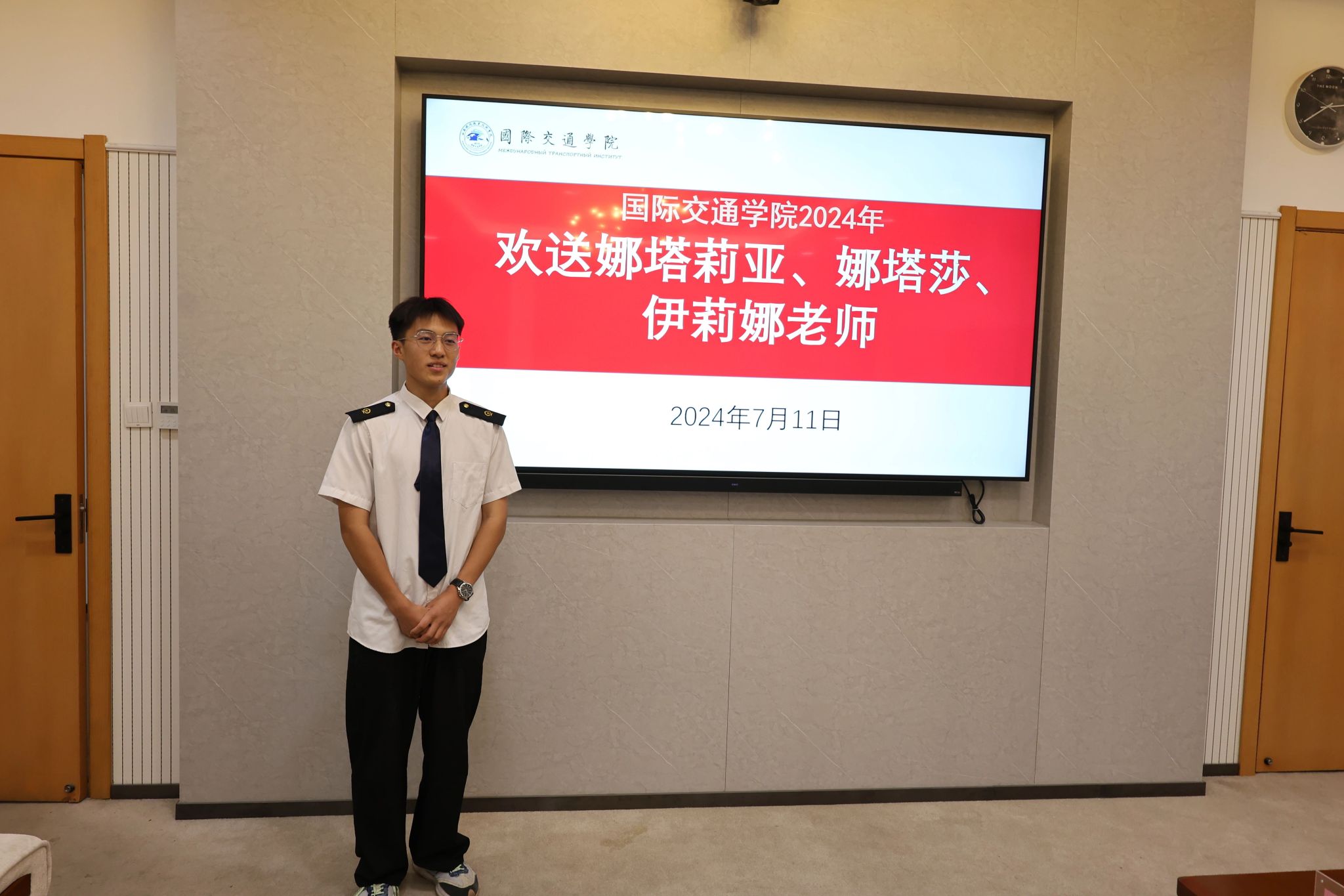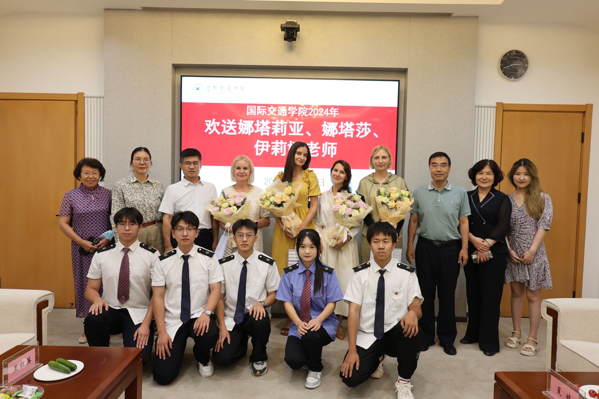 最后,赵春平与滕勇为外籍教师送上精美的礼物,再次向她们表示真挚的感谢和祝福。国际交通学院学生代表送上美丽的鲜花,并合影留念。此次欢送会不仅是对外籍教师辛勤付出的肯定和感谢,更是对中俄两国深厚友谊的见证。作为两国文化交流的使者,她们为学院的国际化办学做出了重要的贡献,希望外籍教师回到俄罗斯之后,能成为中国文化的传播使者,把中国博大精深的文化传播到俄罗斯,做连接中俄两国友谊的桥梁与纽带,为中俄两国教育事业的发展贡献更多力量。