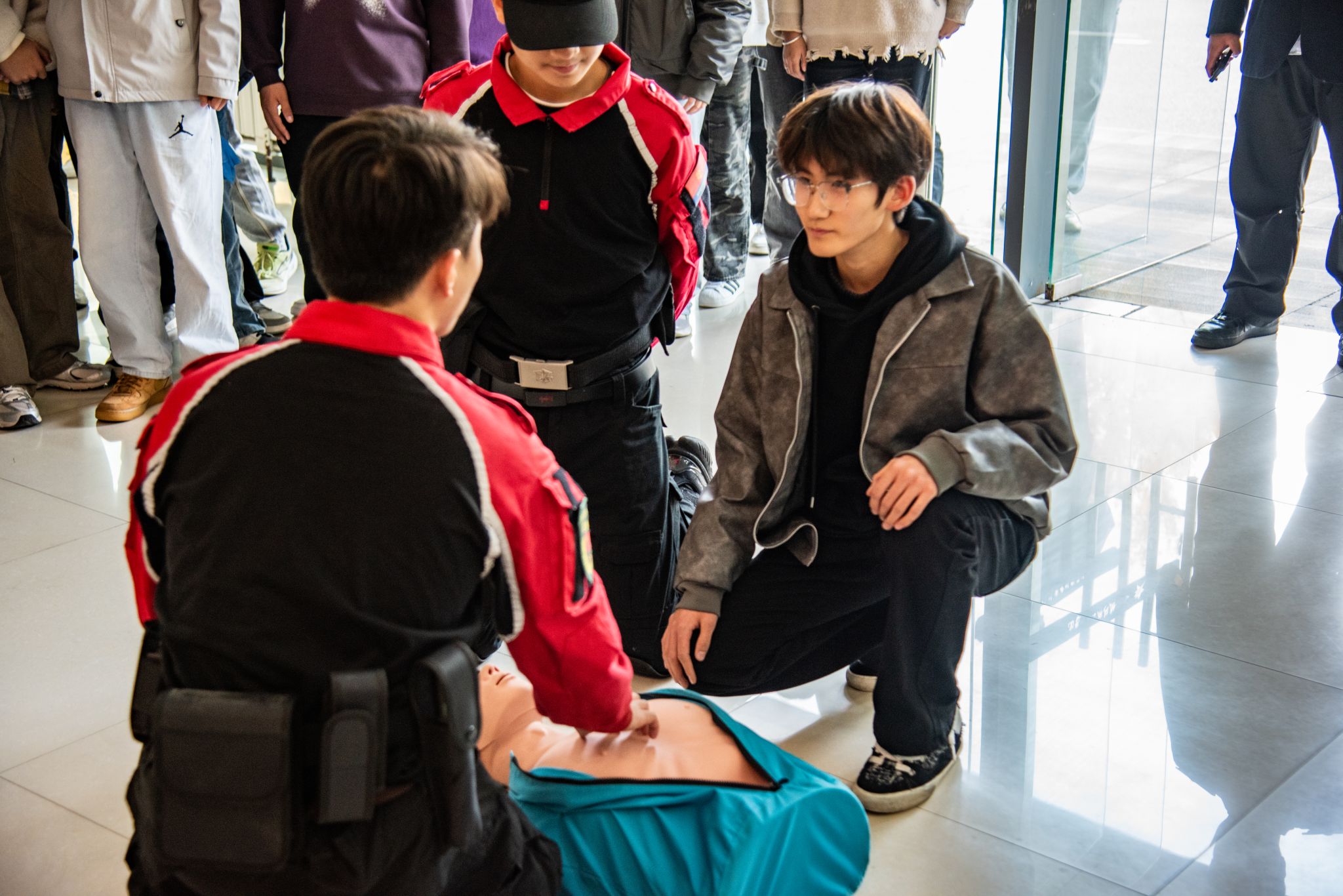 在机电教学楼前,毛卫军为师生们讲解“山西吕梁煤矿火灾”现实案例,警醒师生时刻保持忧患意识、敬畏之心,增强识别灾害、主动防灾避险的能力。两个消防演习专用桶中燃起大火,毛卫军就如何正确使用灭火器、如何扑救初期火灾等知识进行了现场讲解、示范,并组织部分师生现场体验、操作演练,扑灭桶中大火。在精工文化大厅,学院武术社综合应急救援队还为同学们展示了急救包扎和心肺复苏等技能。