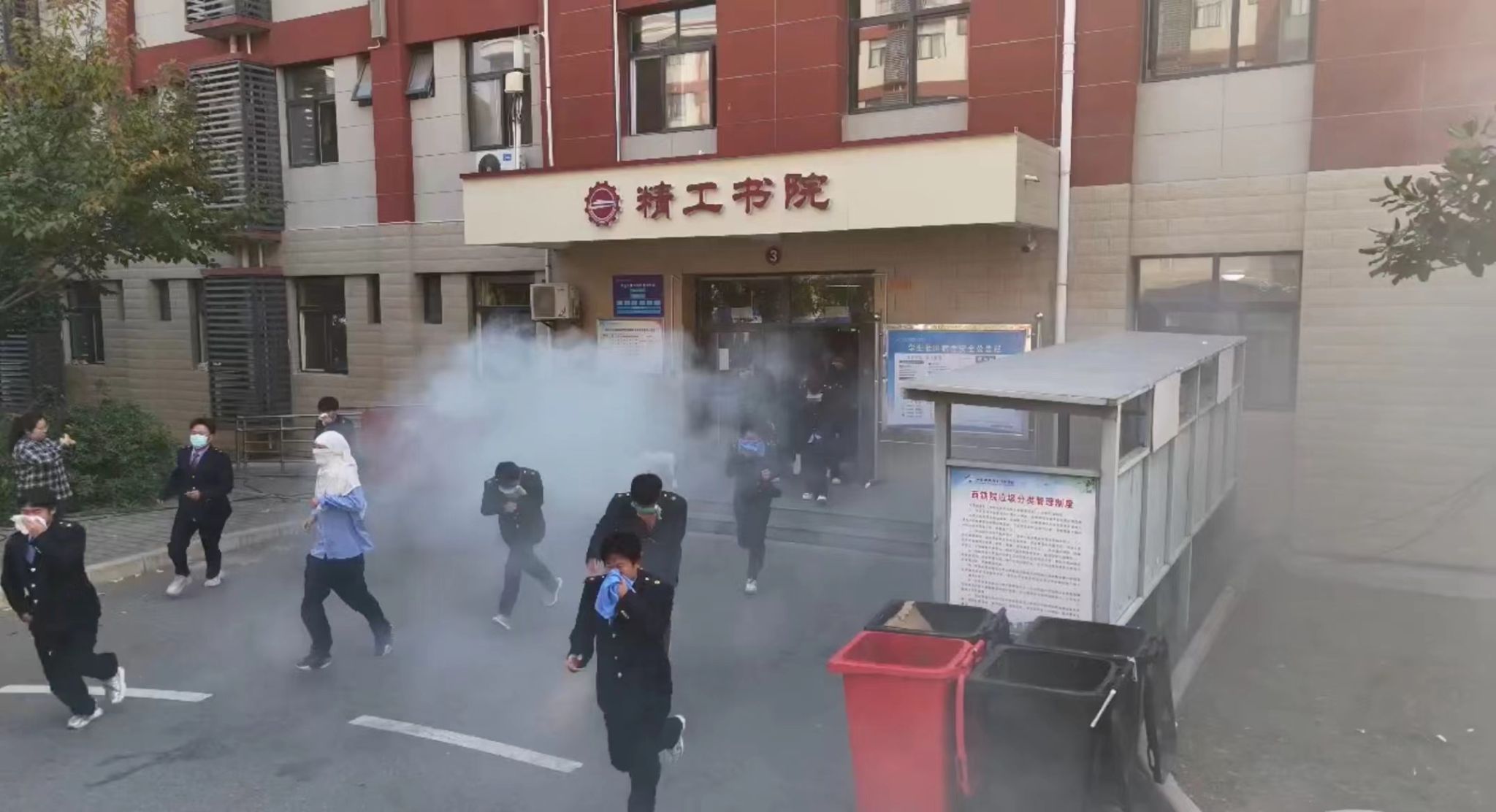 学生社区楼宇里,消防烟雾弾模拟着火后的浓烟环境,各院部组织师生从学生社区楼宇内进行疏散演练,同学们沉着冷静,有序穿过模拟烟雾区域,撤离到指定安全区,各书院在各自疏散集结地进行第一阶段演练的点评总结。