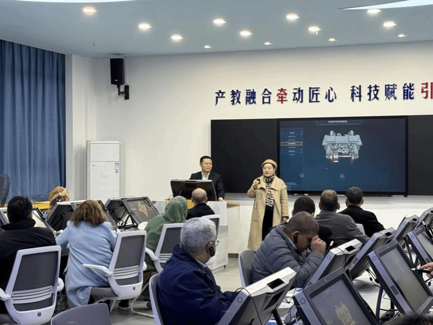 交流团在讲解老师的带领下参观了学院轨道交通综合实训中心、牵引动力学院国家级虚拟仿真实训基地、地铁模拟驾驶实训基地、复兴号模拟驾驶实训室等学生实训中心,了解了贝博官网的发展历史和现代化实践基地的发展现状,并和中国学生一起体验了复兴号动车组模拟驾驶等实训基地相关项目。