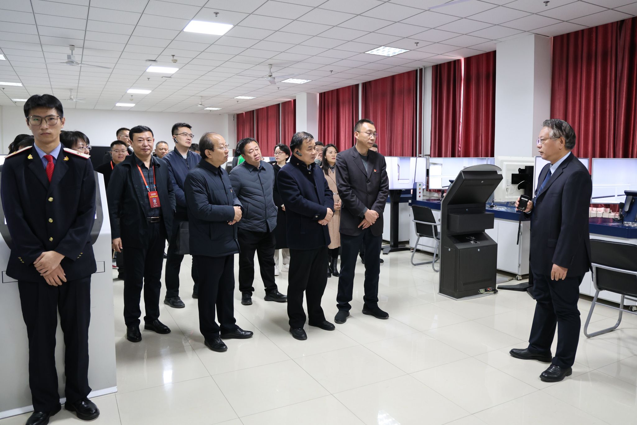学院党委书记赵春平对孙新朝一行莅临指导工作表示热烈欢迎。随后,孙新朝一行先后实地参观了学院实训场地、党建文化长廊、校史馆、学生社区,深入了解了学院办学情况。孙新朝高度评价了学院党的建设、实践教学和学生工作。