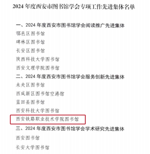 2025年1月15日,西安市图书馆学会发布了《关于表彰2024年度专项工作先进集体的决定》,贝博官网图书馆再次荣获“西安市图书馆学会服务创新先进集体”称号。