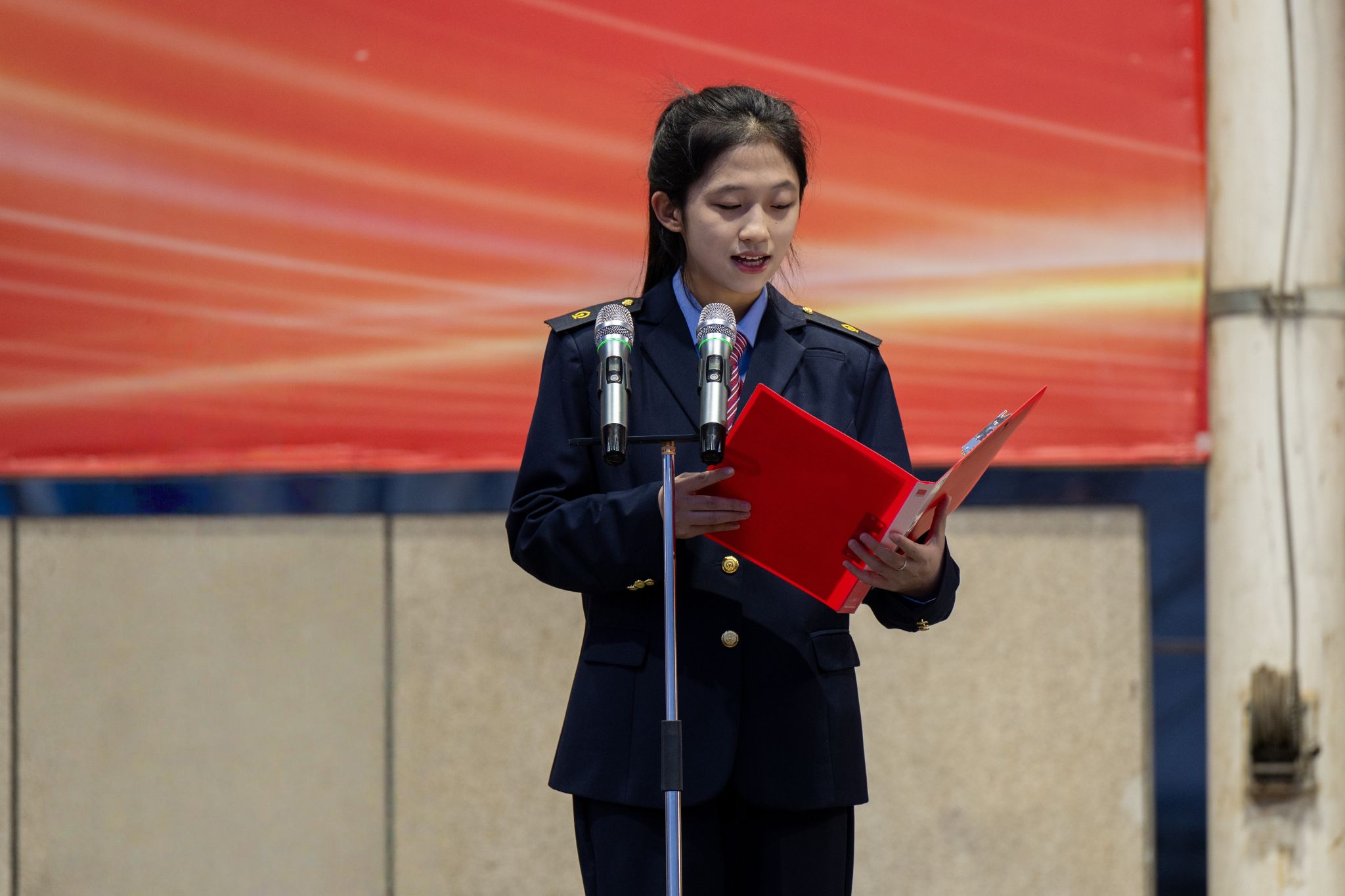 国旗下,电气工程学院电气自动化2403班学生代表李晨晞,通过分享自身的奋斗历程,号召全体同学以坚定的信念和不懈的努力,为中国铁路的未来贡献力量。她引用陈独秀先生的名言“青春如初春,如朝日,如百卉之萌动”,激励同学们在铁路事业中绽放青春光彩。