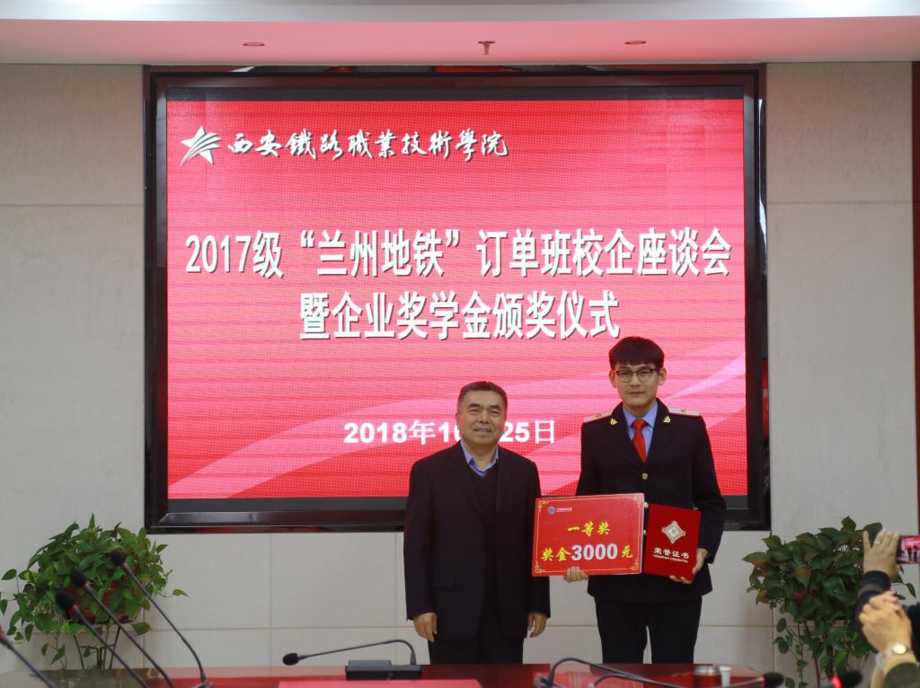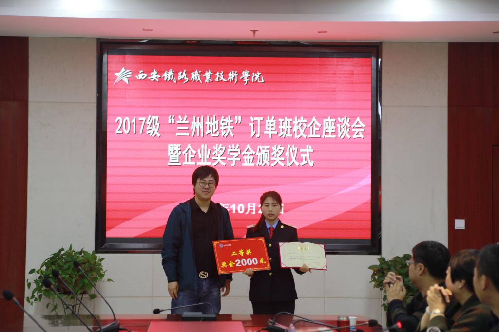 会议还举行了奖学金颁奖仪式,黄家昌、李吉善、张雅兰分别为2017级“兰州地铁”订单班张泽锋、张雪琴、姚伟强3名学生颁发奖学金。他们分别获得由兰州市城市轨道交通有限公司提供的奖学金。姚伟强同学作为“兰州轨道交通有限公司奖学金”获得者代表进行发言。他说,奖学金不仅仅是一种物质体现,更重要的是凝结着兰州轨道交通有限公司对我们订单班学子的殷切期望,我们一定不辜负公司对我们的期望,刻苦学习,砥砺前行,用优异的学习成绩和良好的综合素质报答公司,报效国家的轨道事业。