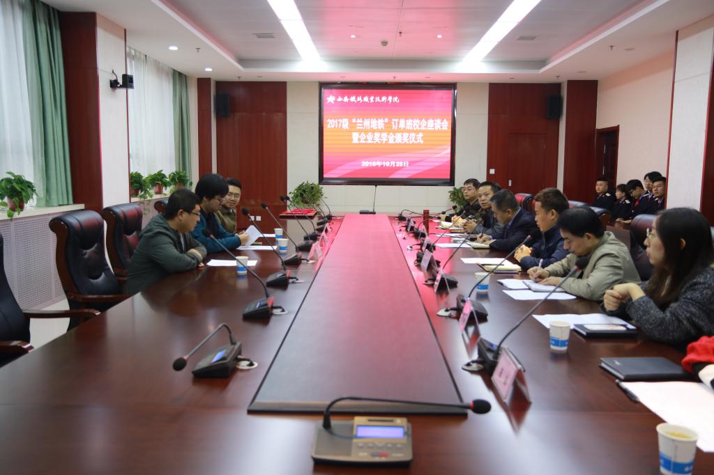 10月25日,兰州市城市轨道交通有限公司与贝博官网举办“兰州地铁”订单班校企座谈会暨企业奖学金颁奖仪式,兰州市城市轨道交通有限公司运营分公司人力资源部副部长李吉善一行三人,贝博官网党委副书记、纪委书记黄家昌,机电工程学院党总支书记张雅兰、院长代礼前和2017级“兰州地铁”订单班的40名师生参加会议。会议由贝博官网招生就业办公室副主任董奇主持。