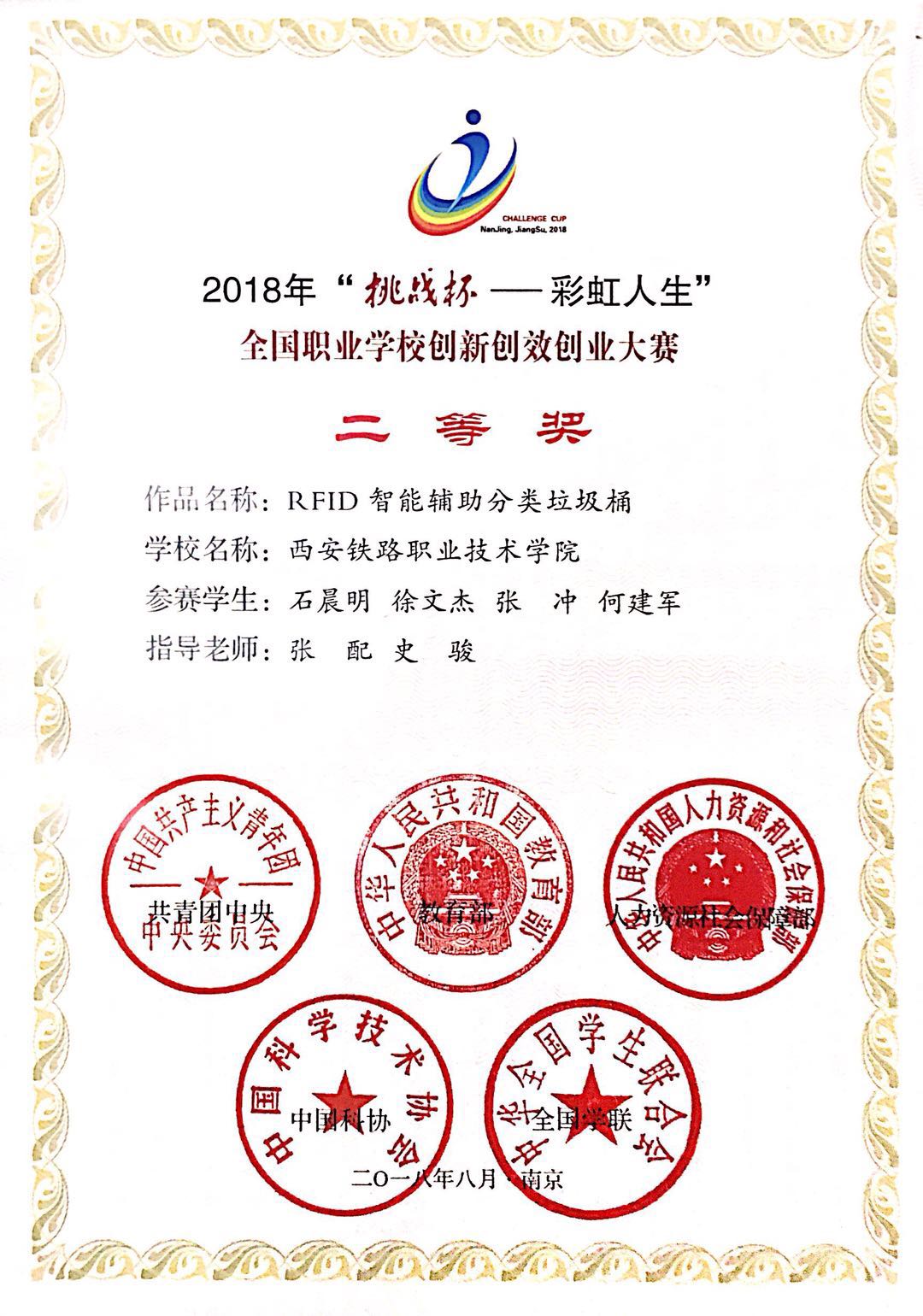 8月14至17日,由共青团中央、教育部、人力资源和社会保障部、中国科协、全国学联、江苏省人民政府共同主办的2018年“挑战杯——彩虹人生”全国职业学校创新创效创业大赛决赛在南京举行。贝博官网机电工程学院史骏、张配老师指导的学生作品《RFID智能辅助分类垃圾桶》,经过专家复赛和决赛的严格评审,最终荣获全国“二等奖”的优异成绩。