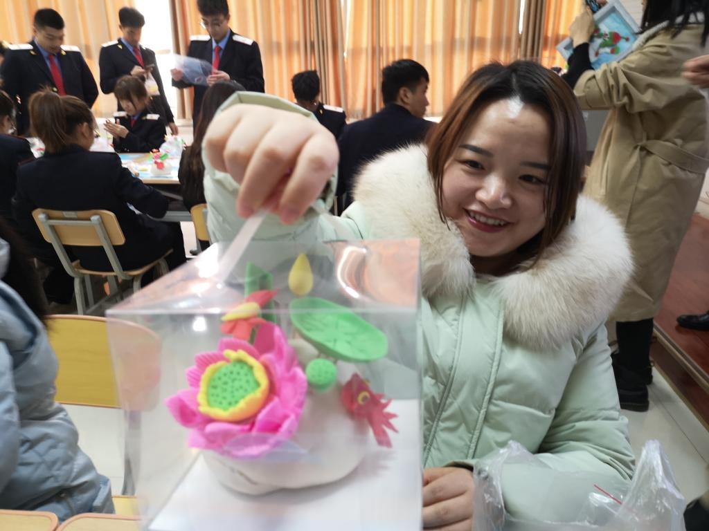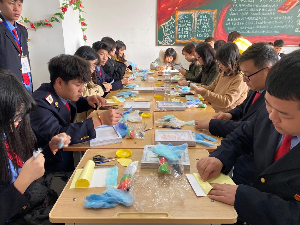 在体验环节中,传承人对参与的师生们当面传授技艺,短短的功夫,色彩艳丽的棉絮和面团在大家的手中变成一幅幅生动的棉絮画和一个个寄予美好愿望的花馍。