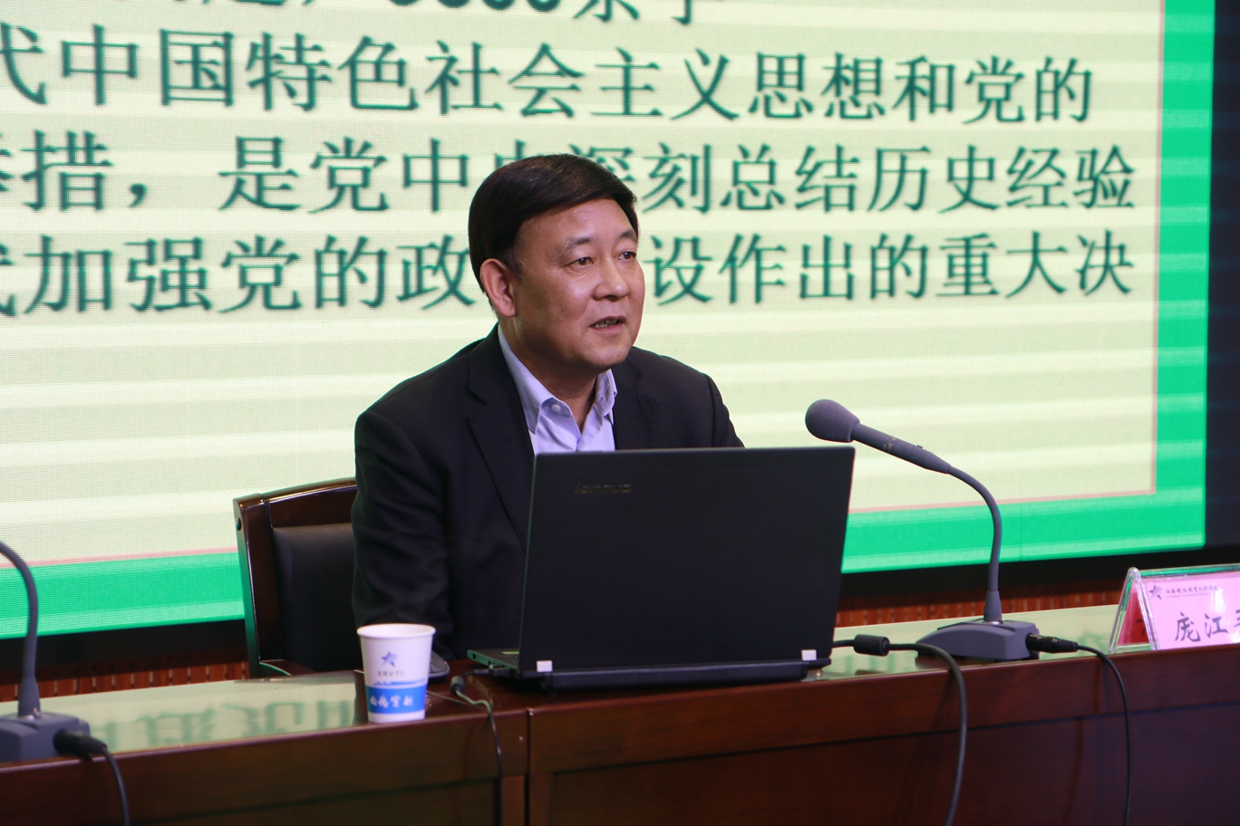 庞江平教授用一个半小时的时间,从“加强党的政治建设的重要意义”“加强党的政治建设的指导思想和目的要求”“加强党的政治建设的主要任务”和“做政治上坚定的西安铁军”四个方面详细解读了《意见》出台的历史背景、主旨要义和中央对加强党的政治建设的部署要求。报告深入浅出、旁征博引,融学术性、实用性、指导性于一体,对于学院进一步加强党的政治建设具有十分重要的指导意义。