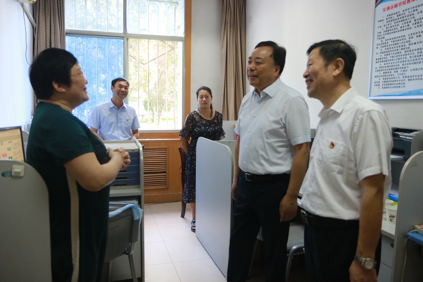 每到一处,施利民首先来到教师办公室看望慰问一线教师。分别与全国优秀教师赵岚教授、工程测量国赛四连冠指导教师张晓雅教授、铁道信号教研室主任冯国良副教授、首届陕西高校思政课教学标兵王晓丽老师及新入职的常艳婷博士等深入交谈,对他们在工作中取得的成绩和获得的荣誉表示祝贺,并详细了解他们的教学、备赛、科研情况,希望他们能够再接再厉,为学院发展做出更多更大的贡献。