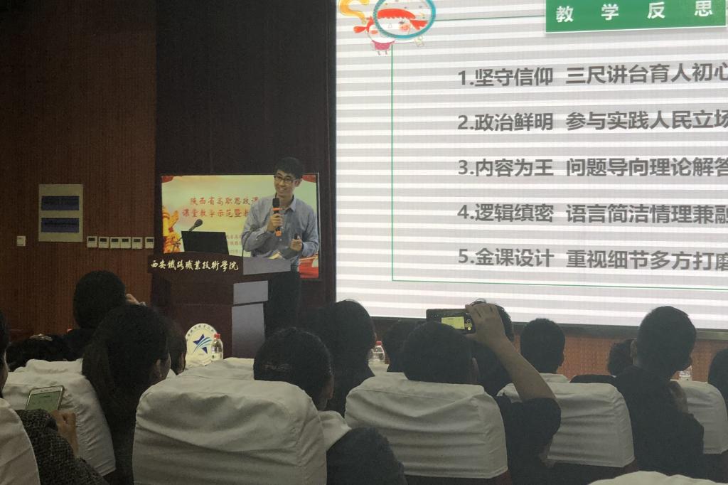此次大会邀请了2018年陕西省思政课教师“大练兵”主题活动中获奖的5名教学标兵,为与会教师进行课堂示范与经验交流。陕西交通职业技术学院的赵其勉老师为大家带来《文化显自信,底气助前行》示范教学和《一个故事一堂课》经验交流,西安航空职业技术学院的田谢军老师作《改革创新是时代要求》示范教学和《上课就是做文章——对上好思政课的思考》经验交流,陕西铁路工程职业技术学院的宋勇老师作《坚决打赢脱贫攻坚战》示范教学和《扶贫与思政课教师》经验交流,西安航空职业技术学院的彭艳老师带来《做文化自信的践行者》示范教学和《春风化雨,润物无声——对如何做一名优秀思政课教师的思考》经验交流,贝博官网的王晓丽老师作《改革开放的必要性》示范教学和《转变思政课“打开方式”,让“有意义”变得“有意思”》经验交流。他们的精彩表现赢得阵阵掌声,获得了全体与会人员的高度认可与赞誉。