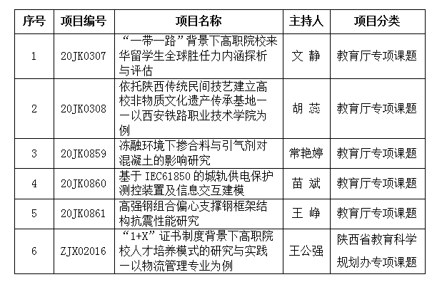 近日,学院有6项课题获批省级立项,其中5项课题获批教育厅2020年度科学研究计划项目立项,1项课题获批陕西省职业教育“1+X”证书制度专项研究课题立项。