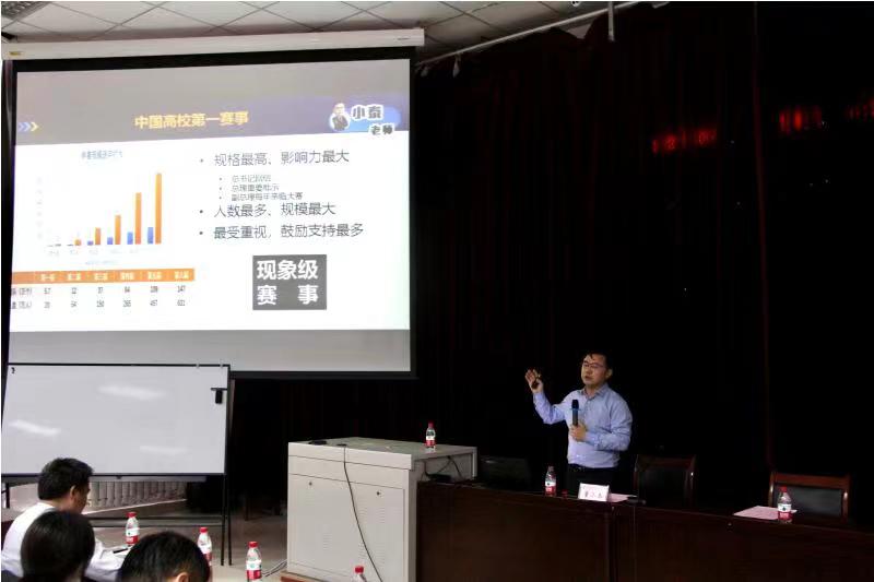 随后,董小泰为与会师生做了专题培训,他依据教育部、省教育厅大赛文件,详细解析了今年大赛在办赛内涵、赛道设置、项目类型等方面产生的变化;结合贝博官网及兄弟院校过往六届参加“互联网+”大赛取得的成绩,深入分析了贝博官网今年参加“互联网+”大赛面临的机遇与挑战;结合自己“互联网+”大赛丰富的评审经验,讲解了大赛的评审规则和评判标准,分享了项目获奖的制胜关键,并从规则研读、题目甄选、团队组建、逻辑梳理、素材补充、网评资料、路演答辩等方面分七步讲授了备赛方法及备赛策略。培训过程中,董小泰旁征博引、妙语迭出,为全院师生呈现了一场精彩的备赛讲座。