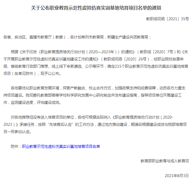 日前,根据教育部《关于公布职业教育示范性虚拟仿真实训基地培育项目名单的通知》(教职成司函〔2021〕35号),贝博官网“轨道列车智能运行与维护系统虚拟仿真综合实训基地”被教育部正式确定为职业教育示范性虚拟仿真实训基地培育项目。