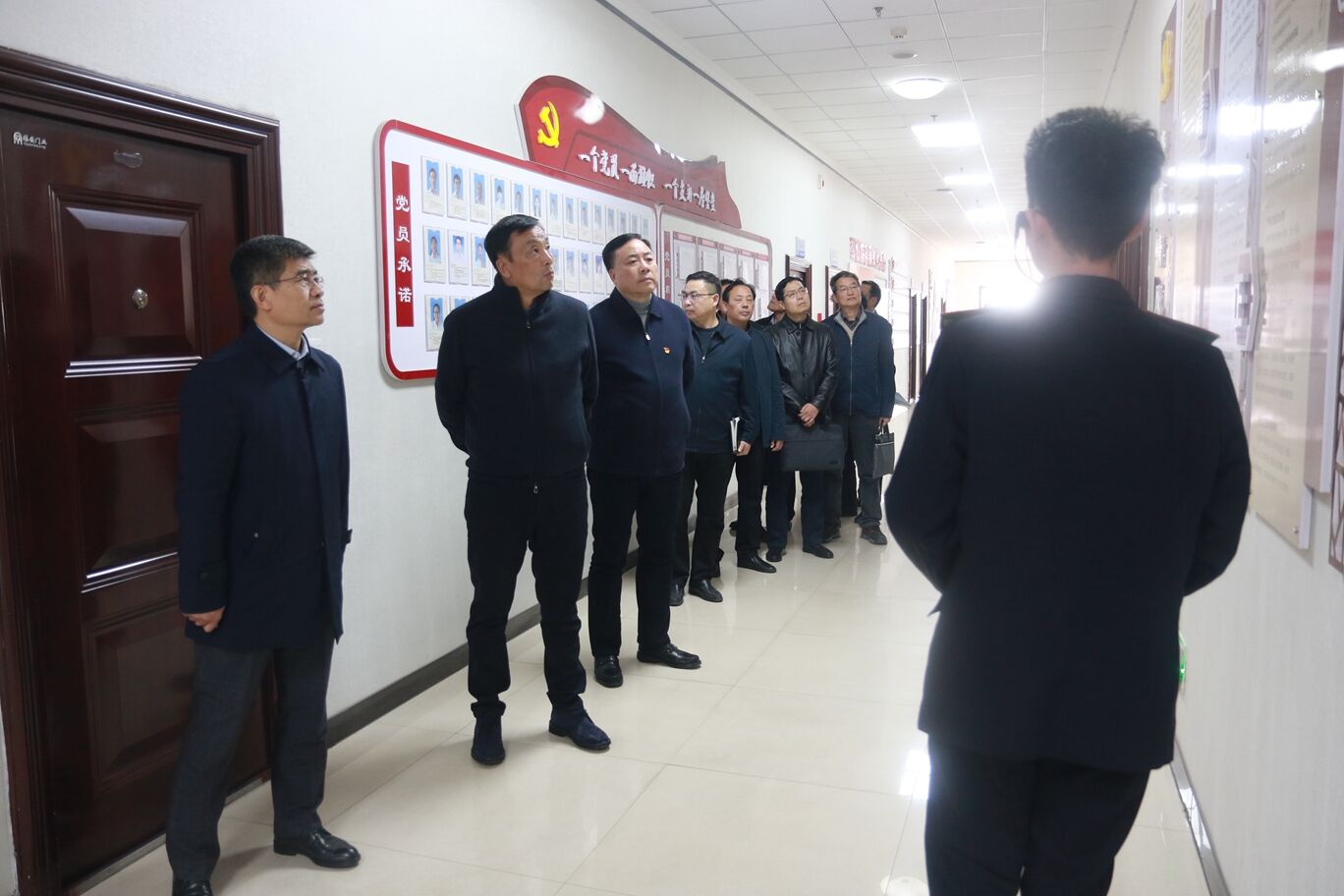张海涛一行首先来到学院红色文化教育实践基地,详细了解学生思政教育、学生党员发展、党员积分制及党建特色工作。