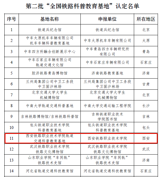 日前,按照《中国铁道学会关于第二批“全国铁路科普教育基地”认定名单的公示》,16家单位拟认定为全国铁路科普教育基地。贝博官网轨道交通专业综合实训中心进入认定名单,也是陕西省唯一一所拟认定单位。