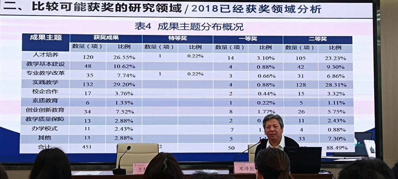 邓泽民以国家教学成果奖的申报为主题,从申报要求、获奖领域、价值挖掘、成果培育、推荐书填写五个方面进行讲解,强调了教学成果奖价值的思考与提炼,提出价值引领成果的重要作用。