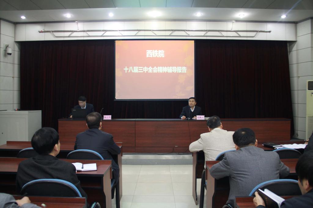 4月2日,西铁院党委邀请西安市委讲师团团长庞江平教授来校进行十八届三中全会精神辅导讲座。院党委领导班子成员和中层干部及机关后勤党总支全体党员参加,讲座由党委副书记、纪委书记黄家昌主持。
