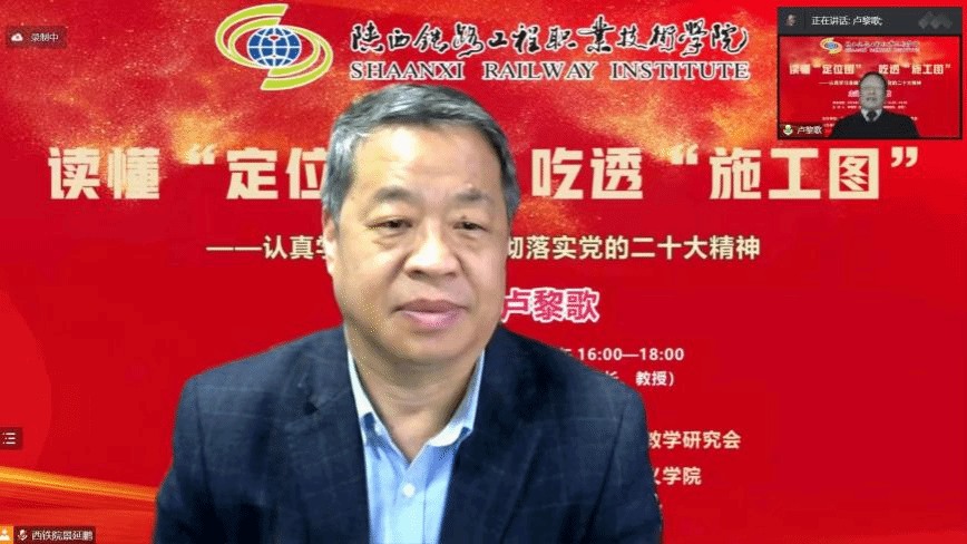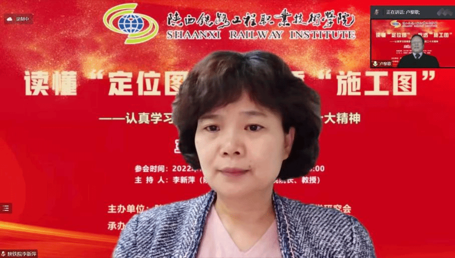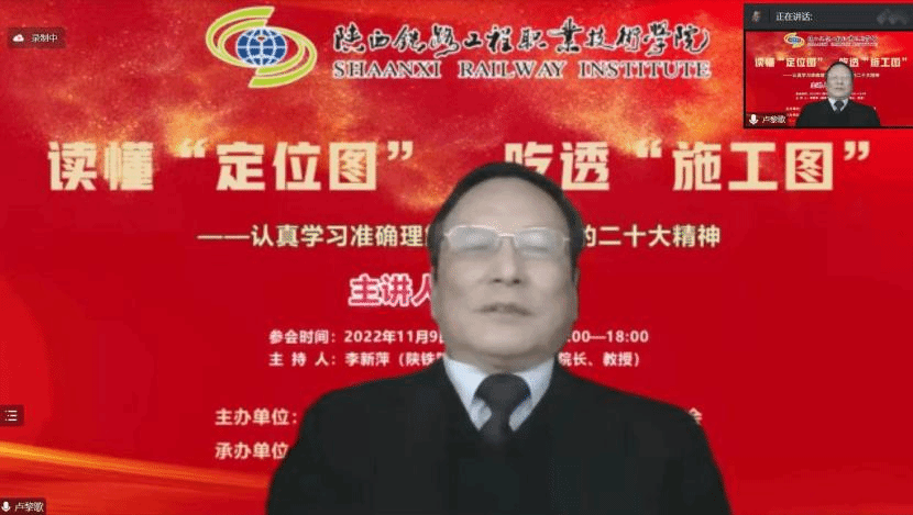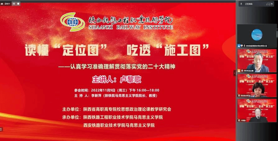 11月9日下午,“党的二十大精神主题报告会”在线上成功举办,本次会议由陕西省高职高专院校思想政治理论课教学研究会主办,陕西铁路工程职业技术学院马克思主义学院、ballBET贝博BB艾弗森马克思主义学院共同承办。会议邀请到了西安交通大学马克思主义学院二级教授、博士生导师卢黎歌教授,作了题为“读懂‘定位图’ 吃透‘施工图’——认真学习准确理解贯彻落实党的二十大精神”的主题报告。陕西省高职高专思政课教学研究会副会长、陕铁院马克思主义学院院长李新萍教授主持会议,陕西省高职高专思政课教学研究会副会长、西铁职院马克思主义学院院长景延鹏出席并发言。会议吸引了省内省外、线上线下共22所高校及单位、260余名思政教师热情参与。贝博官网马克思主义学院60多位专兼职思政课教师在线参加了报告会。