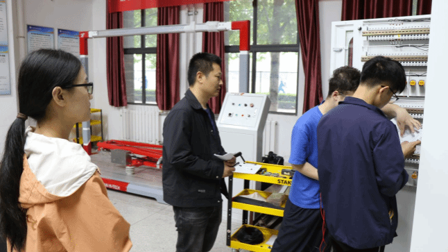 刘博首先详细参观了牵引动力学院的各专业实训室,对现有的实训设备是赞不绝口。他认为这些实训设备完全满足培养新时代地铁系统需求全面发展的高素质技术技能人才的要求。随后,刘博观看了参加第二届全国技能大赛陕西省选拔赛“轨道车辆技术”赛项的学生训练并给出了不少建设性指导意见。