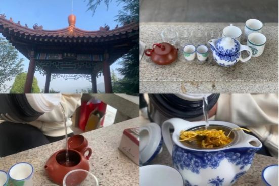 经过一段崎岖的山路,大家来到了芝兰亭歇息。芝兰亭是华清宫的一处优雅的园林景点,这里有许多芝兰花的芳香和优美的园林景色。古人有在重阳节饮菊花酒之风俗,菊花酒在古代被看作是重阳必饮、祛灾祈福的“吉祥酒”。今天同学们也准备了菊花,芝兰亭内聊茶道,沏菊花茶,聊菊文化,以茶代酒,共庆重阳。