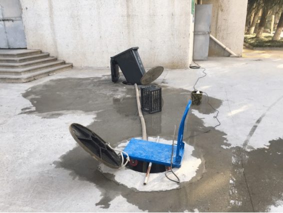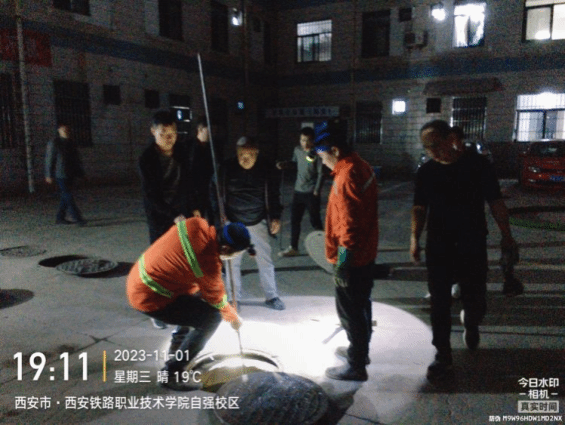 组织总务科水、电值班人员对综合管沟积水区域、学生三公寓北侧广场区域10余个下水井盖逐一打开进行排查,反复查看管道走向、管网分布,研判积水原因,确定淤积、堵塞点。