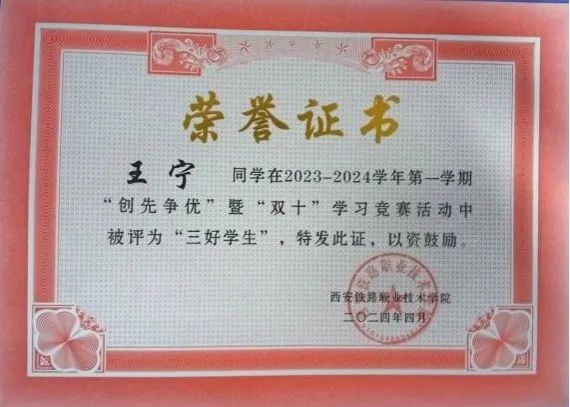王宁,土木工程学院建筑工程技术专业2302班学生,共青团员。在校期间努力学习,上一学年个人成绩专业第一,担任班级学习委员,学生会心理部部长。荣获国家励志奖学金、三好学生、年级学习标兵、优秀共青团员等荣誉。善于沟通、乐于帮助同学、随机应变能力强,在校期间积极参与组织学院开展的各类活动。