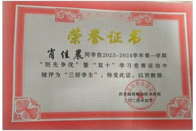 肖佳晨,土木工程学院高速铁路施工与维护专业2301班学生,共青团员。上一学年个人成绩专业第二。担任班级学习委员,学生会学习部部长。荣获国家励志奖学金、三好学生、优秀学生干部、年级学习标兵等荣誉。细心沉稳、善于沟通、乐于帮助同学、随机应变能力强,多次参与各类竞赛和学校组织的志愿者活动。