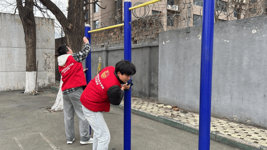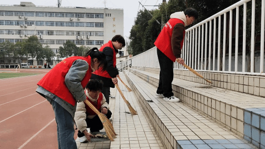 随后,团总支干部带领各班志愿者迅速开始了一场意义非凡的校园清扫活动,同学们有条不紊地开展清扫工作。在教学楼前,同学们手持扫帚、簸箕,认真清扫着每一处角落,不放过任何一片落叶、一张纸屑。一些同学还主动清理墙壁上的小广告,他们用铲子小心地铲除,再用湿布仔细擦拭,使教学楼的墙面焕然一新。